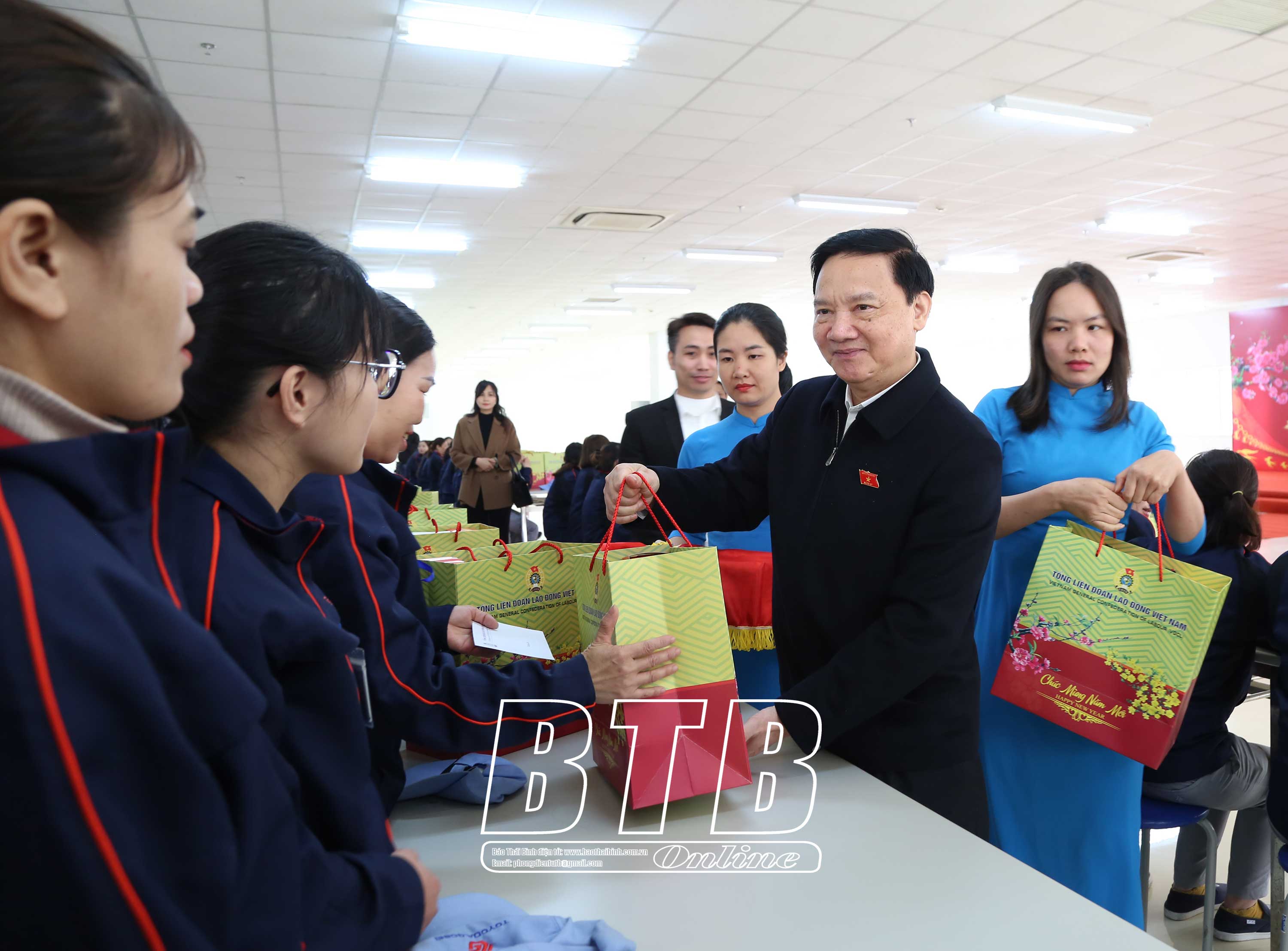 Đồng chí Nguyễn Khắc Định, Ủy viên Ban Chấp hành Trung ương Đảng, Phó Chủ tịch Quốc hội và lãnh đạo Tổng Liên đoàn Lao động Việt Nam tặng quà chúc tết công nhân Nhà máy Toyoda Gosei Thái Bình.