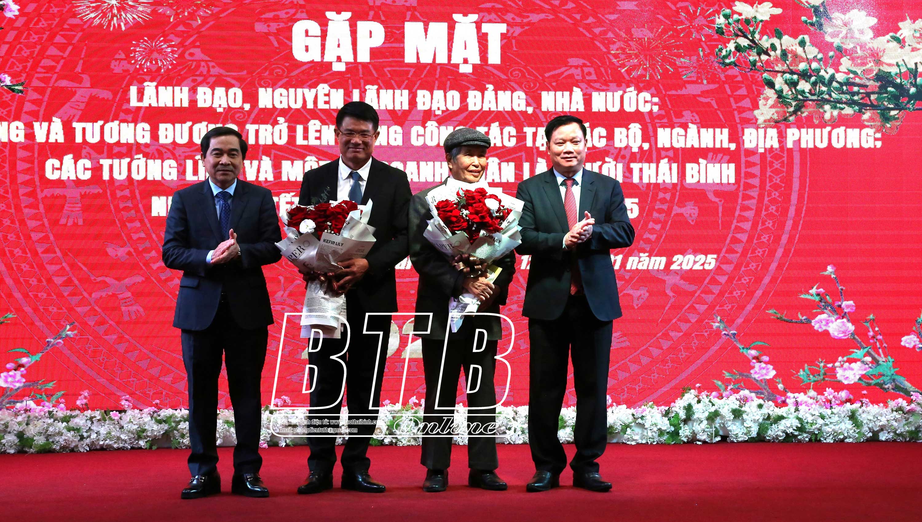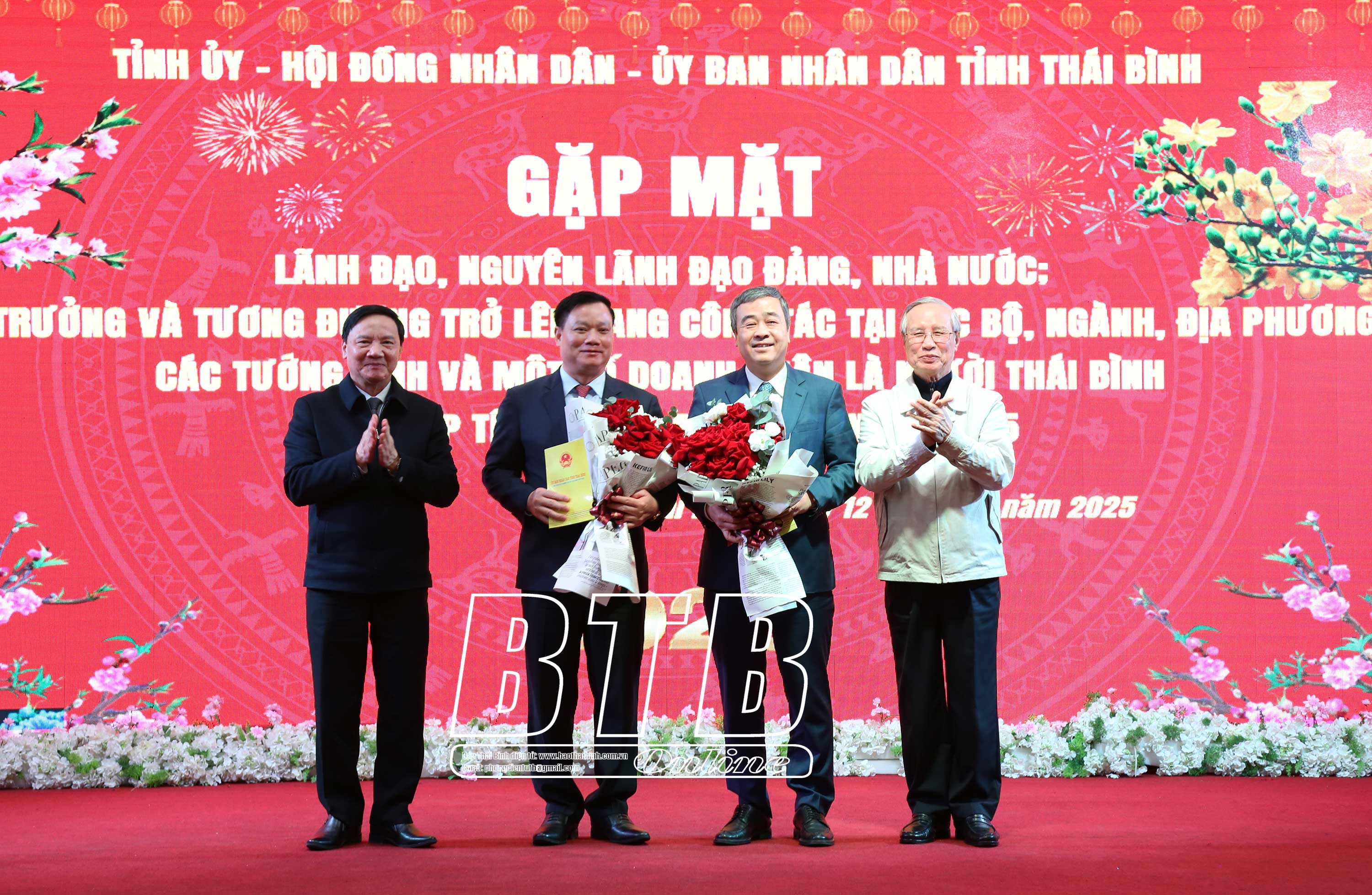 Dự buổi gặp mặt có các đồng chí: Trần Quốc Vượng, nguyên Ủy viên Bộ Chính trị, nguyên Thường trực Ban Bí thư Trung ương Đảng; Nguyễn Khắc Định, Ủy viên Ban Chấp hành Trung ương Đảng, Phó Chủ tịch Quốc hội; Nguyễn Hồng Diên, Ủy viên Ban Chấp hành Trung ương Đảng, Bộ trưởng Bộ Công Thương; Lương Quốc Đoàn, Ủy viên Ban Chấp hành Trung ương Đảng, Chủ tịch Hội Nông dân Việt Nam; Ngô Đông Hải, Ủy viên Ban Chấp hành Trung ương Đảng, Phó Trưởng ban Tuyên giáo Trung ương, Trưởng đoàn đại biểu Quốc hội tỉnh Thái Bình; Nguyễn Huy Tiến, Viện trưởng Viện Kiểm sát nhân dân tối cao.