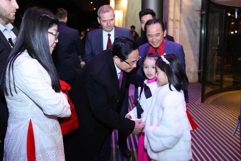 Bà con cộng đồng người Việt Nam nồng nhiệt chào đón Thủ tướng Phạm Minh Chính và Phu nhân cùng Đoàn đại biểu cấp cao Việt Nam tới thủ đô Warsaw thăm chính thức Ba Lan (Ảnh: NHẬT BẮC/VGP).