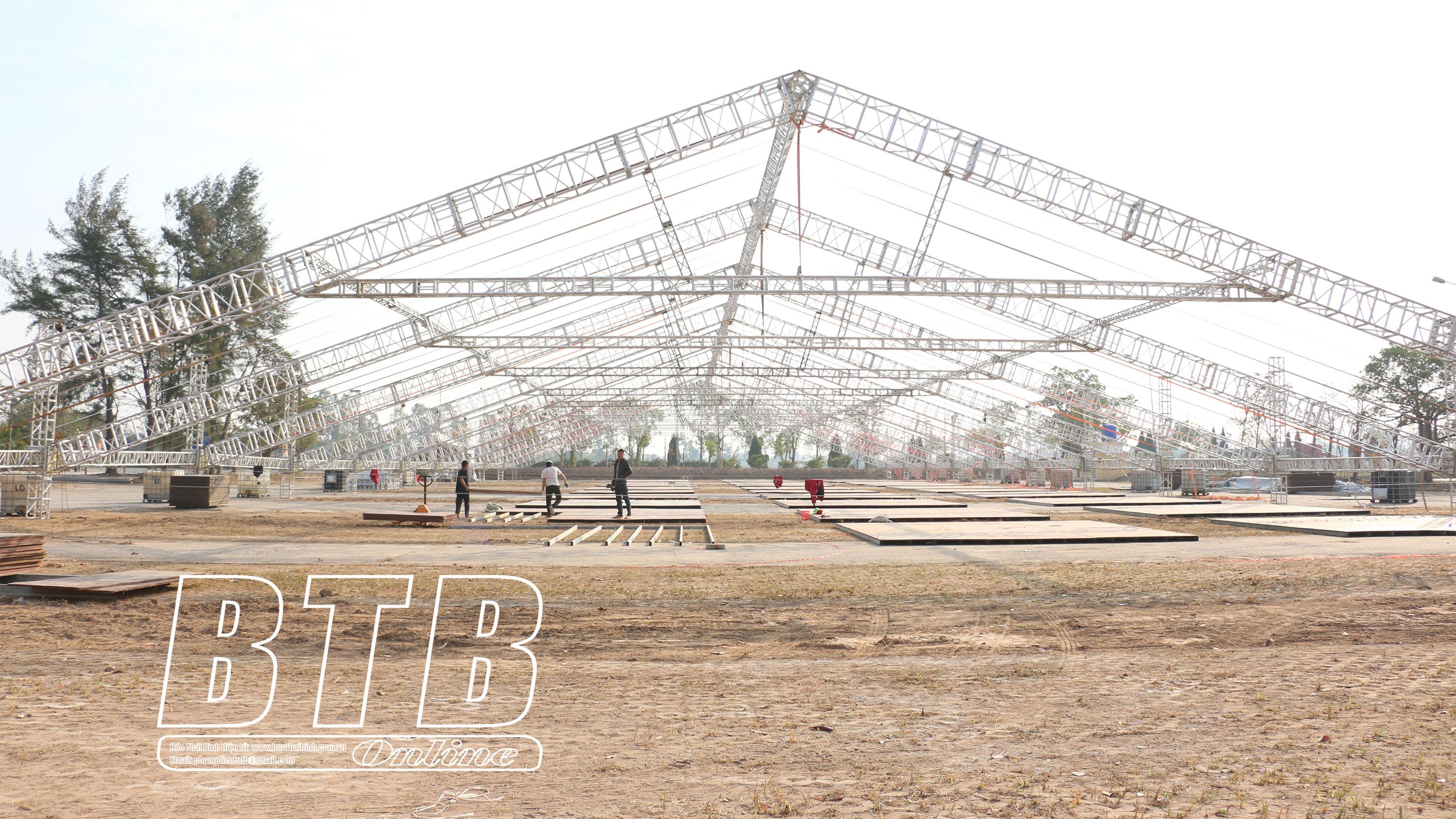Đơn vị tổ chức sự kiện đang gấp rút lắp đặt khu vực sân khấu khai mạc lễ hội đền Trần và khu vực các gian hàng tham gia hội chợ.