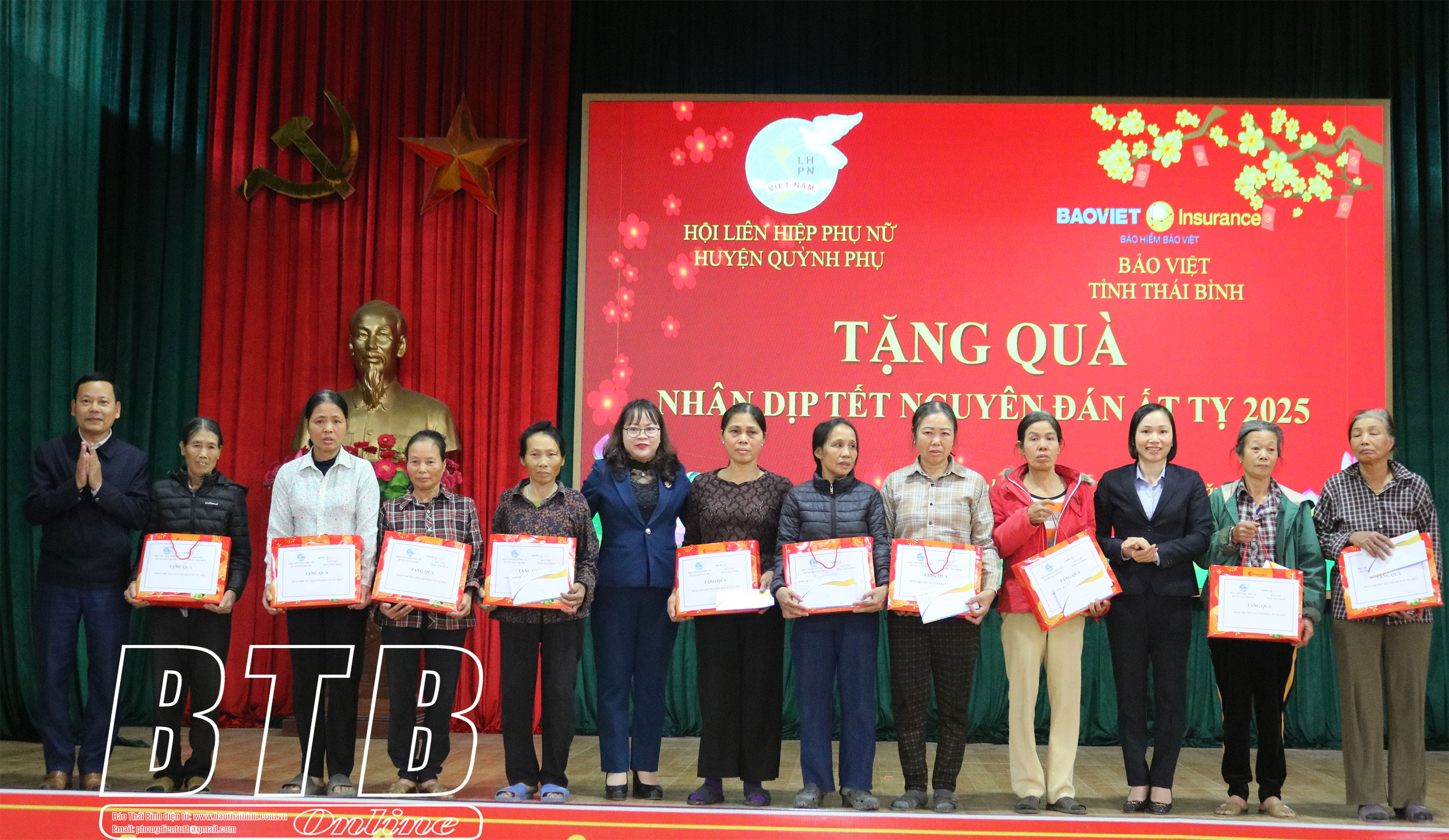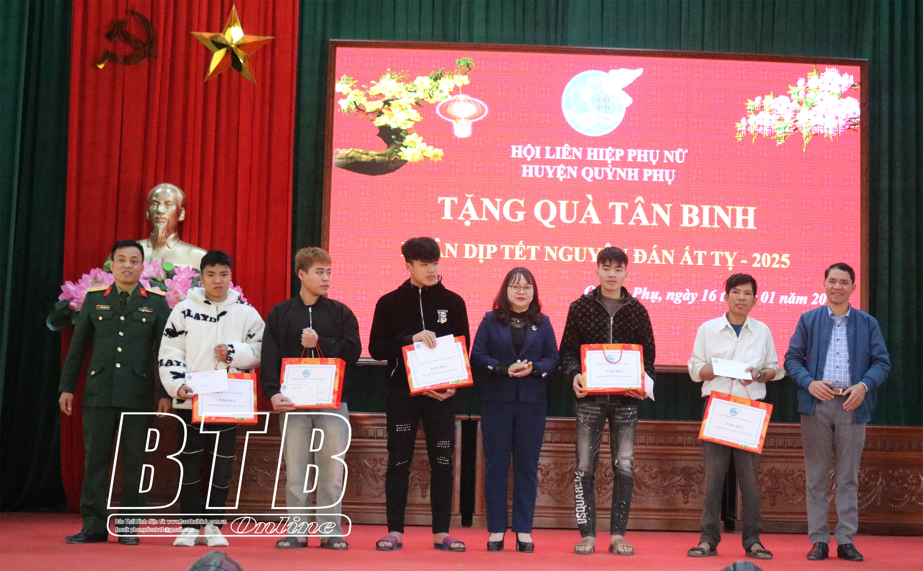 42 suất quà tết được Hội LHPN huyện và Bảo Việt Thái Bình trao cho 12 tân binh và 30 hội viên phụ nữ có hoàn cảnh khó khăn của 4 xã: Quỳnh Khê, Quỳnh Hoàng, Quỳnh Lâm và Quỳnh Ngọc, mỗi suất trị giá 400 nghìn đồng với mong muốn các tân binh và phụ nữ có hoàn cảnh khó khăn đón tết vui vẻ, yên tâm lên đường nhập ngũ.