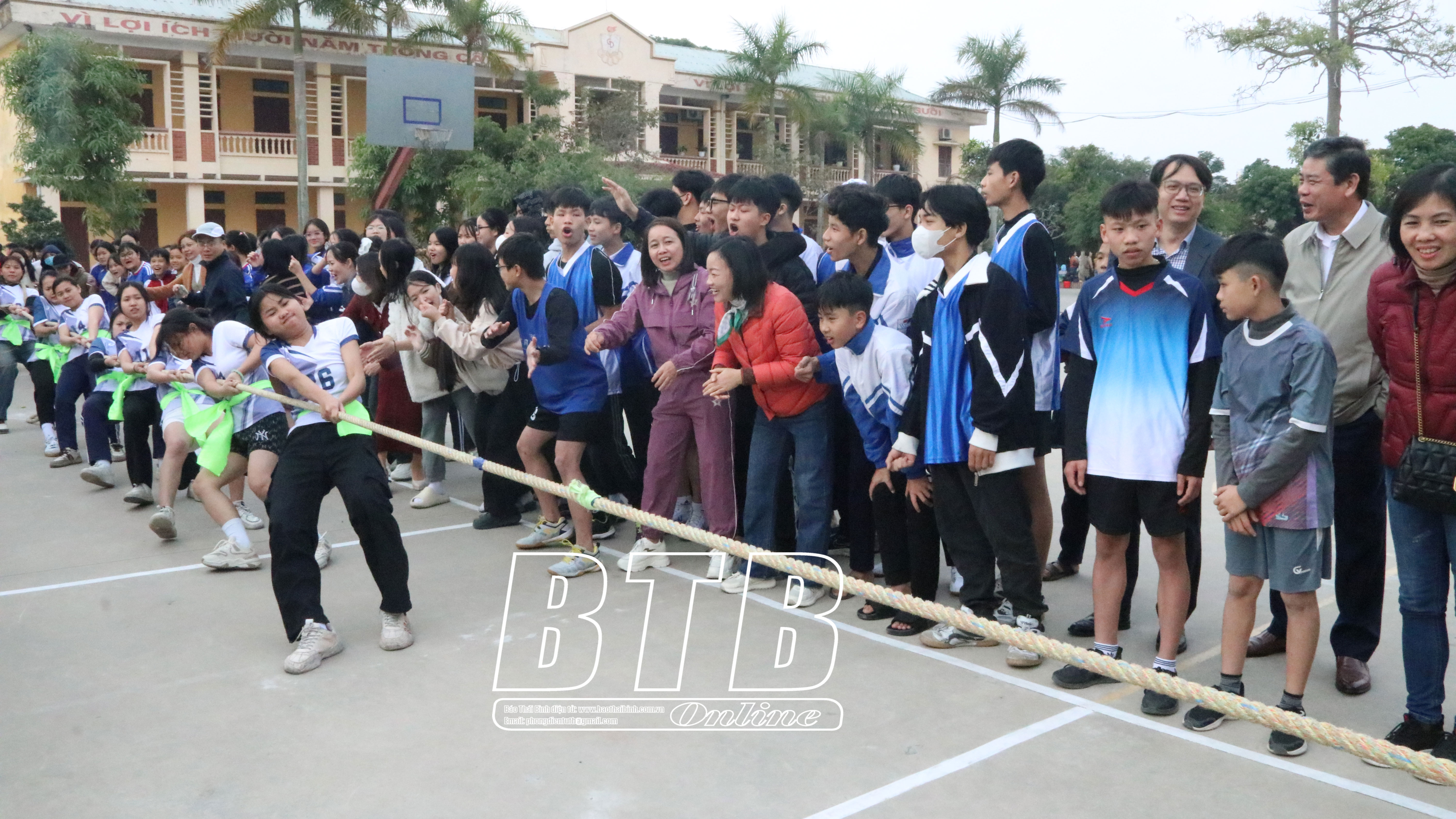 Các vận động viên thi đấu môn kéo co với sự cổ vũ nhiệt tình của cổ động viên.