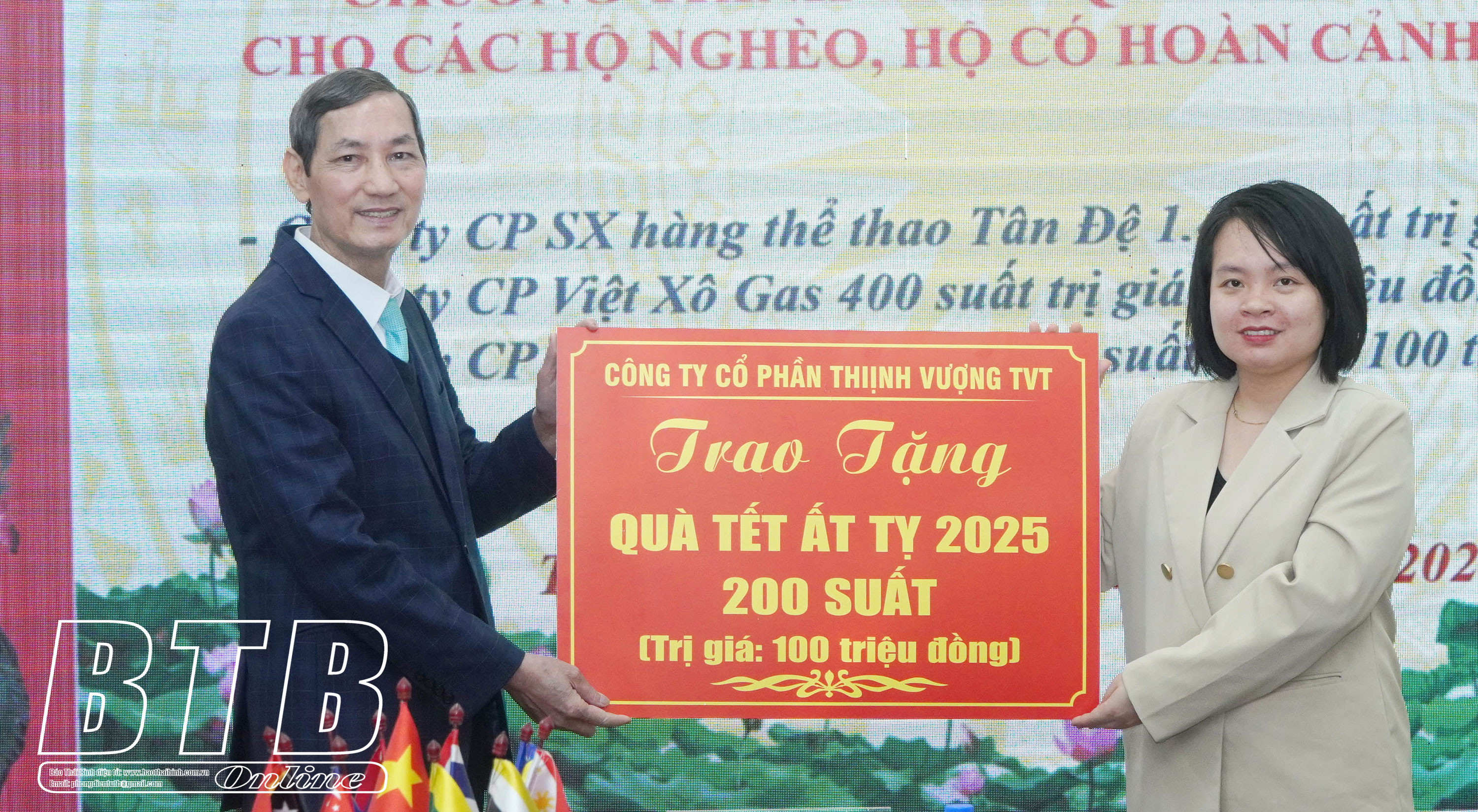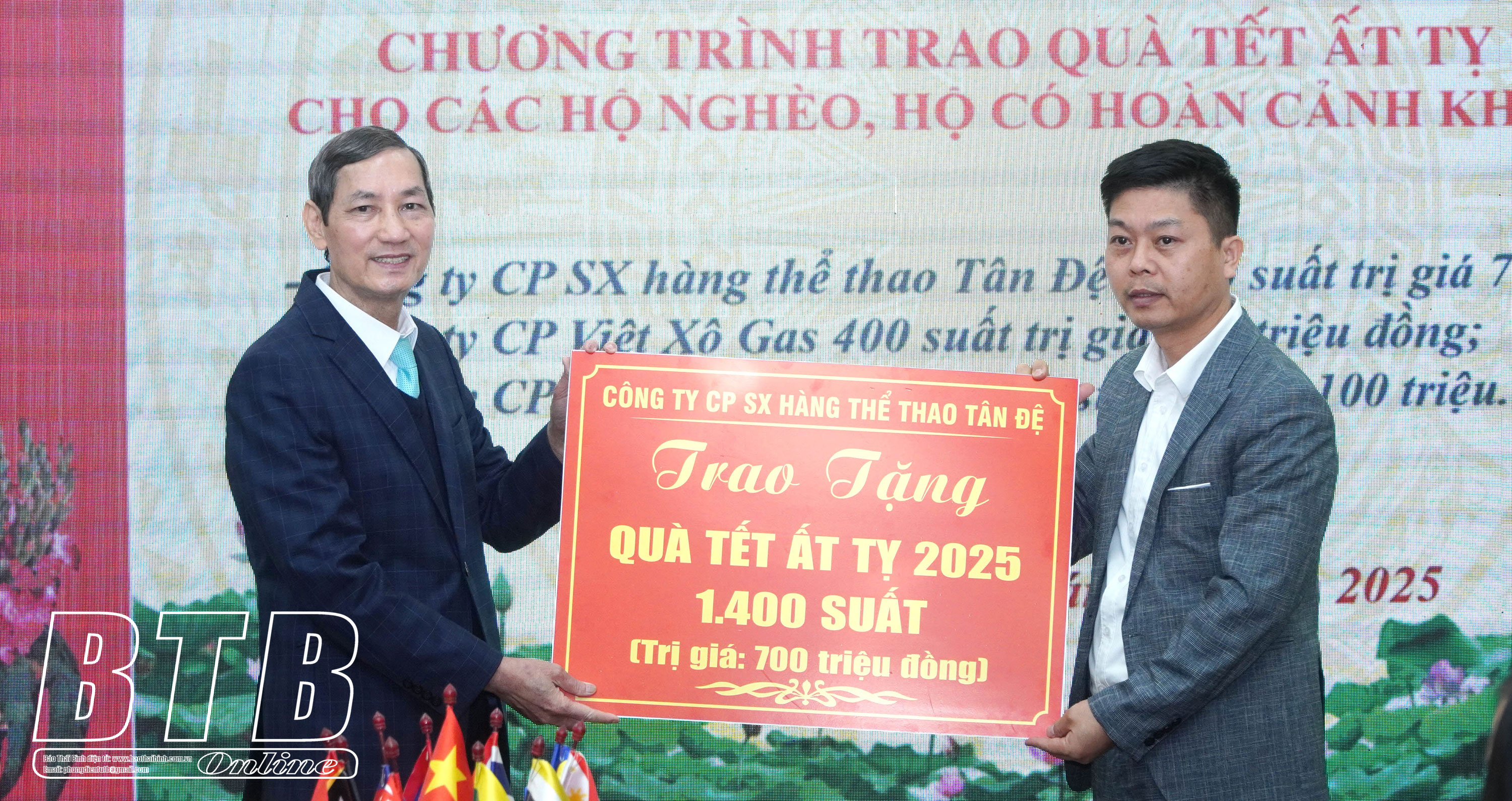 Tại chương trình, Hiệp hội Doanh nghiệp tỉnh đã tiếp nhận 1.400 suất quà với trị giá 700 triệu đồng của Công ty Cổ phần Sản xuất hàng thể thao Tân Đệ, 400 suất quà với trị giá 200 triệu đồng của Công ty Cổ phần Việt Xô gas, 200 suất quà với trị giá 100 triệu đồng của Công ty Cổ phần Thịnh Vượng TVT; đồng thời tổ chức trao các phần quà cho 13 đầu mối đơn vị, địa phương gồm đại diện Ủy ban MTTQ Việt Nam tỉnh, Hội Nạn nhân chất độc da cam/Điôxin, Hội Bảo trợ người khuyết tật và Bảo vệ quyền trẻ em, Hội Cựu chiến binh, Sở Lao động - Thương binh và Xã hội, Đoàn đại biểu Quốc hội tỉnh cùng một số đơn vị, địa phương khác để trao lại tận tay các đối tượng chính sách có hoàn cảnh khó khăn, hộ nghèo, hộ cận nghèo.