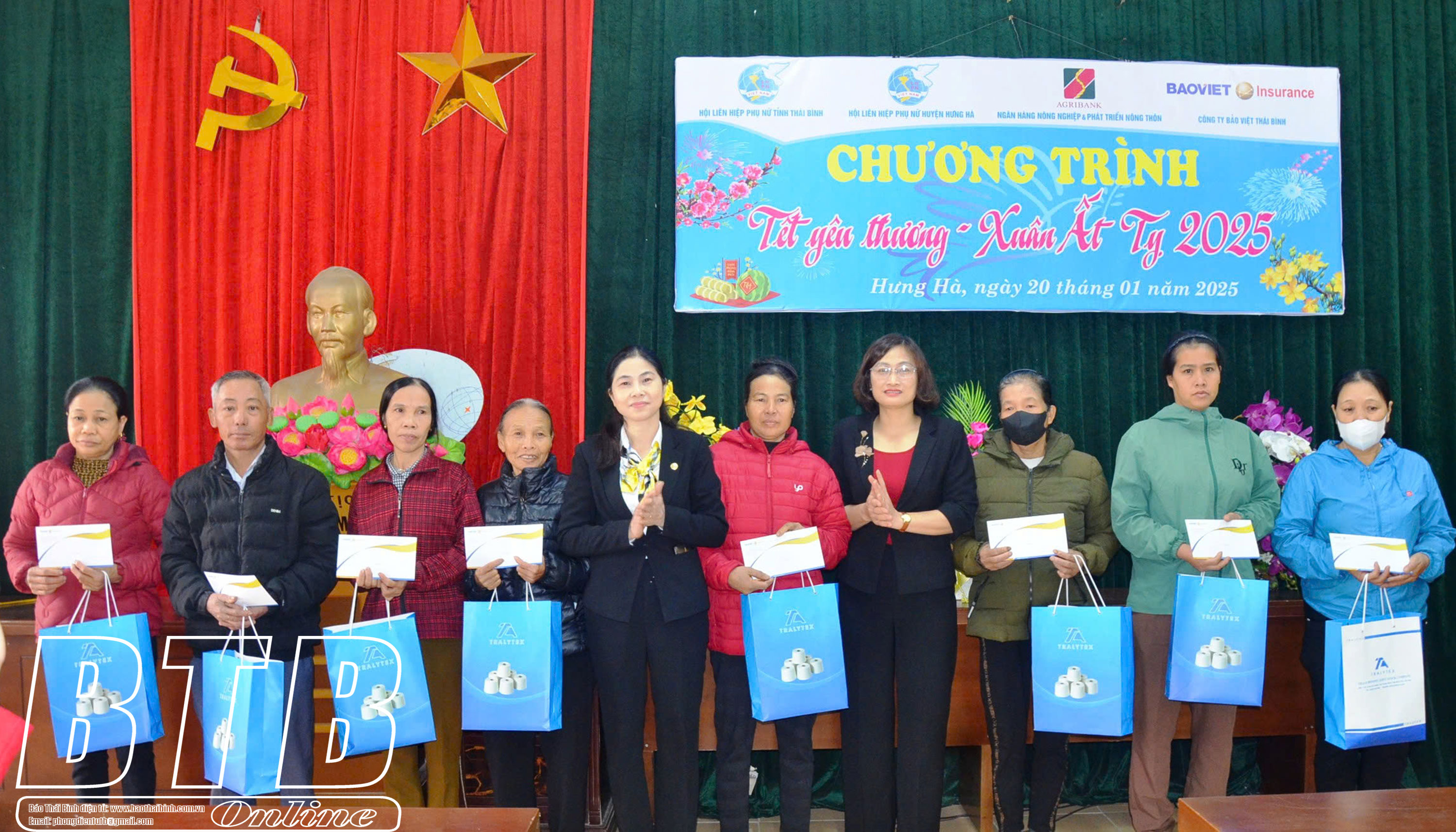 Nhân dịp tết Nguyên đán Ất Tỵ 2025, sáng ngày 20/1, Hội Liên hiệp Phụ nữ (LHPN) huyện Hưng Hà phối hợp với Ngân hàng Nông nghiệp và Phát triển nông thôn huyện; Công ty Bảo Việt Thái Bình trao tặng hơn 100 suất quà tết cho phụ nữ nghèo các xã, thị trấn trên địa bàn huyện với trị giá hơn 40 triệu đồng.
