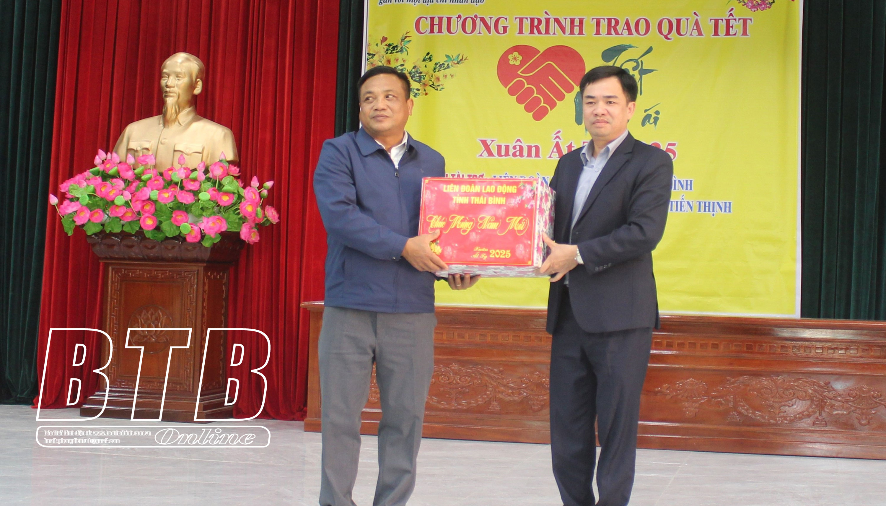 Lãnh đạo Liên đoàn Lao động tỉnh và Công ty Cổ phần Phát triển đầu tư và Xây lắp Tiến Thịnh trao quà cho hộ nghèo, hộ cận nghèo và hộ có hoàn cảnh khó khăn của xã Trang Bảo Xá (Quỳnh Phụ).