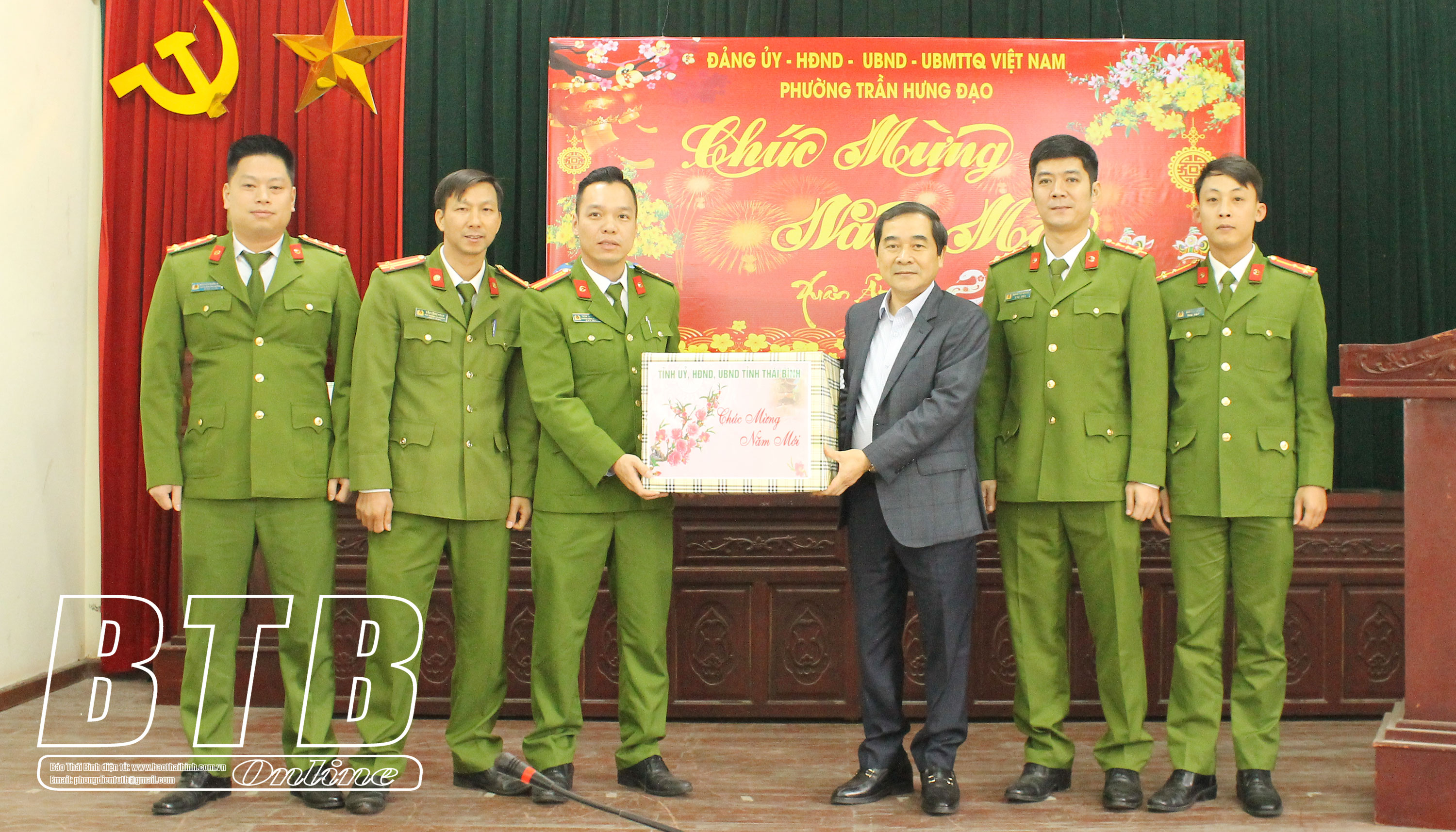 Đồng chí Nguyễn Tiến Thành, Phó Bí thư thường trực Tỉnh ủy, Chủ tịch HĐND tỉnh trao quà tết, động viên cán bộ, chiến sĩ Công an phường Trần Hưng Đạo làm tốt công tác bảo đảm an ninh trật tự dịp tết.