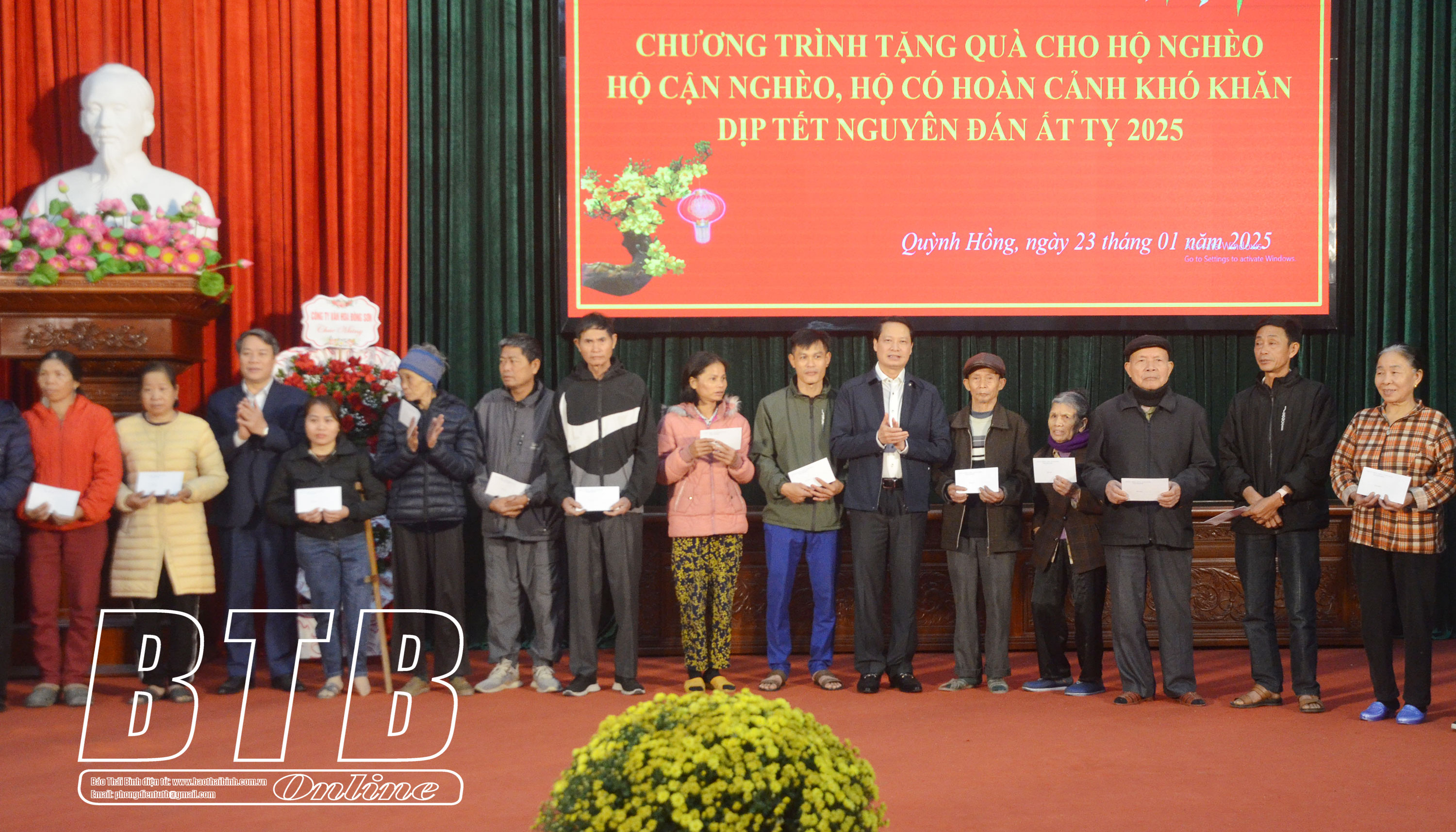 Nhân dịp tết Nguyên đán Ất Tỵ 2025, sáng ngày 23/1, đồng chí Hoàng Thái Phúc, Ủy viên Ban Thường vụ, Trưởng ban Nội chính Tỉnh ủy và một số doanh nghiệp trên địa bàn huyện Quỳnh Phụ đã trao 193 suất quà tết cho hộ nghèo, hộ cận nghèo, hộ có hoàn cảnh khó khăn của xã Quỳnh Hồng (Quỳnh Phụ).