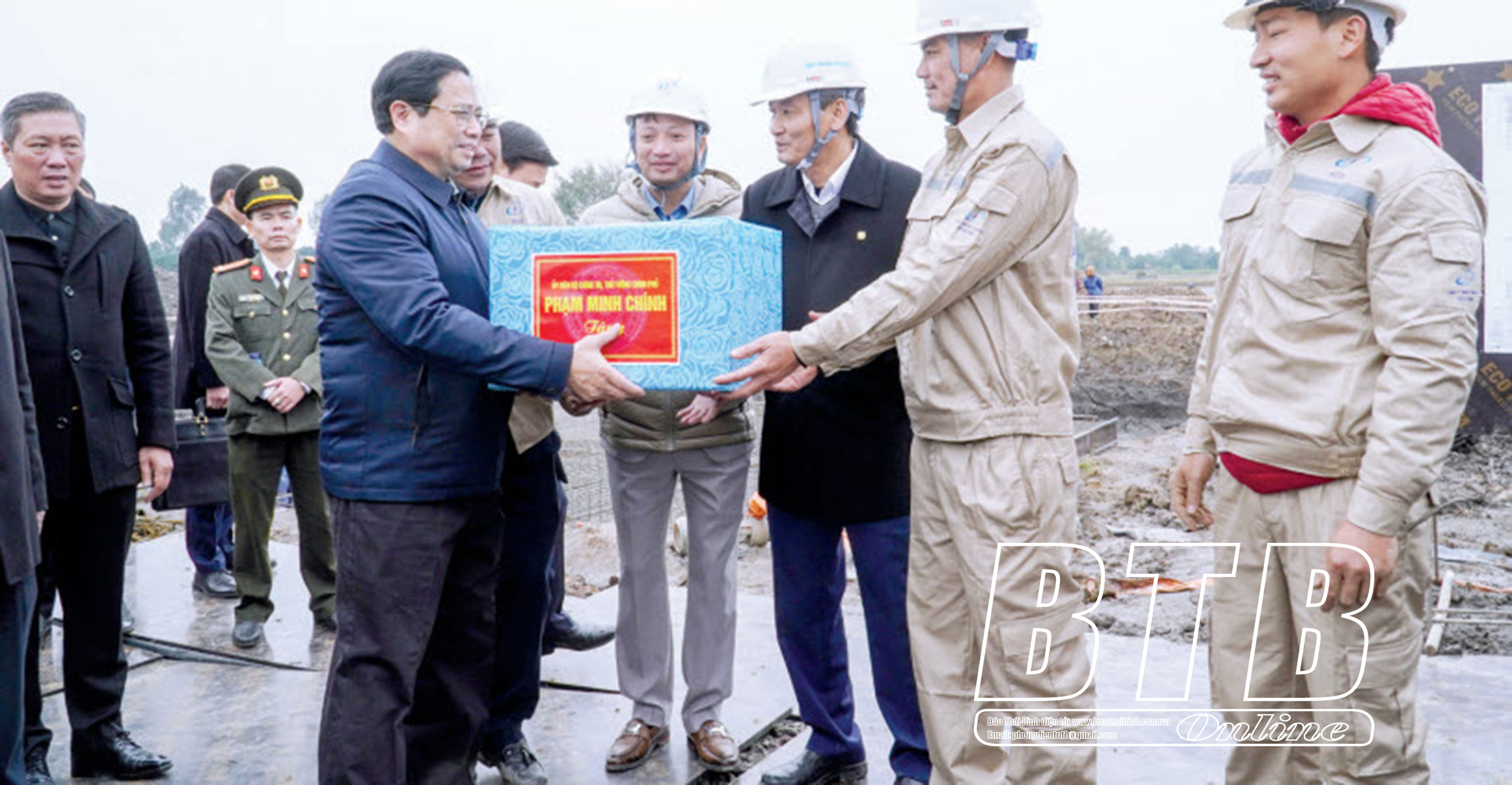 Thủ tướng Chính phủ Phạm Minh Chính tặng quà động viên công nhân thi công dự án đường dây 500kV mạch 3 tại móng cột vị trí số 201 thuộc địa bàn xã Châu Sơn (Quỳnh Phụ), ngày 27/1/2024.