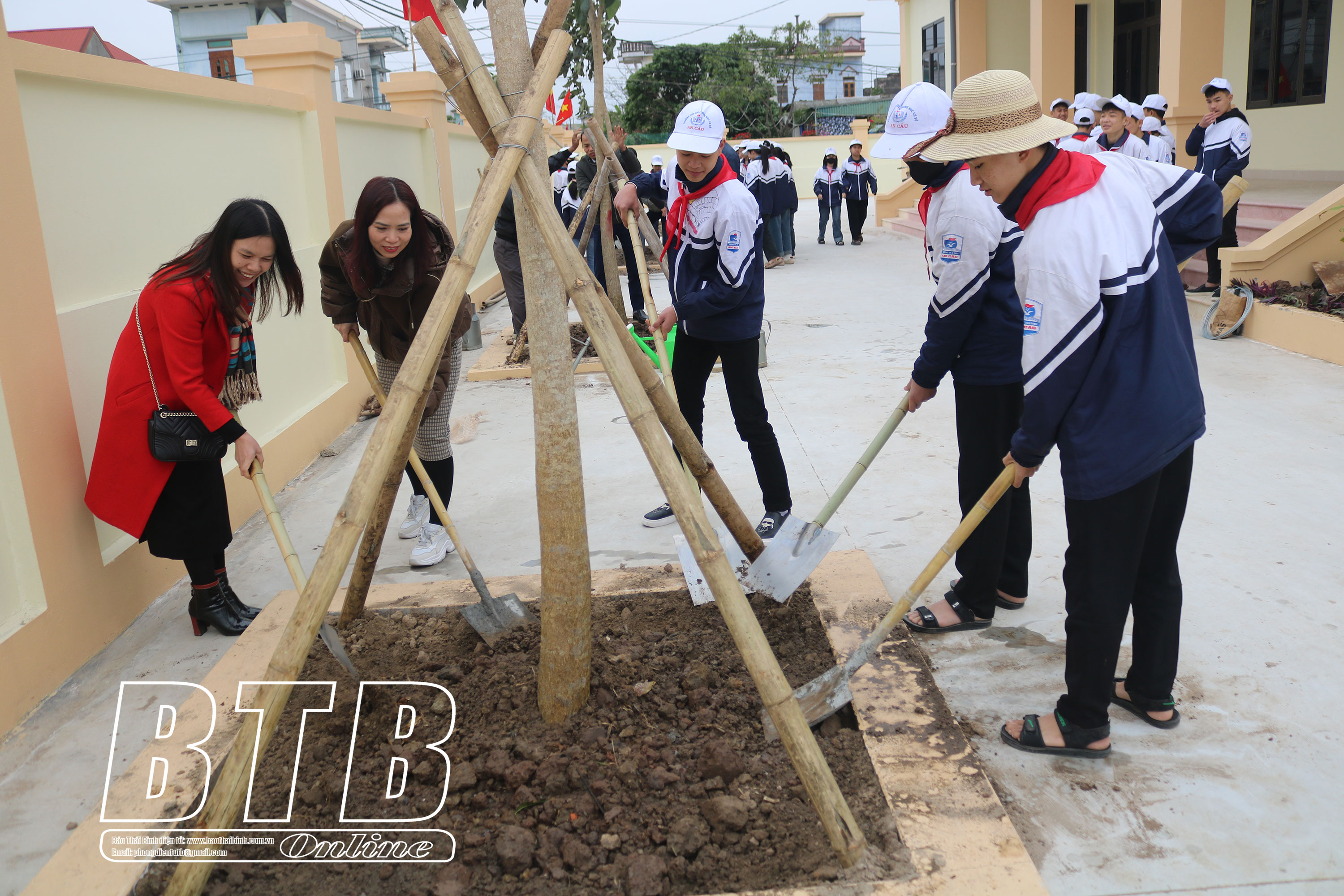 Các em học sinh tham gia trồng cây tại khuôn viên nhà trường. Ảnh: Thu Thủy