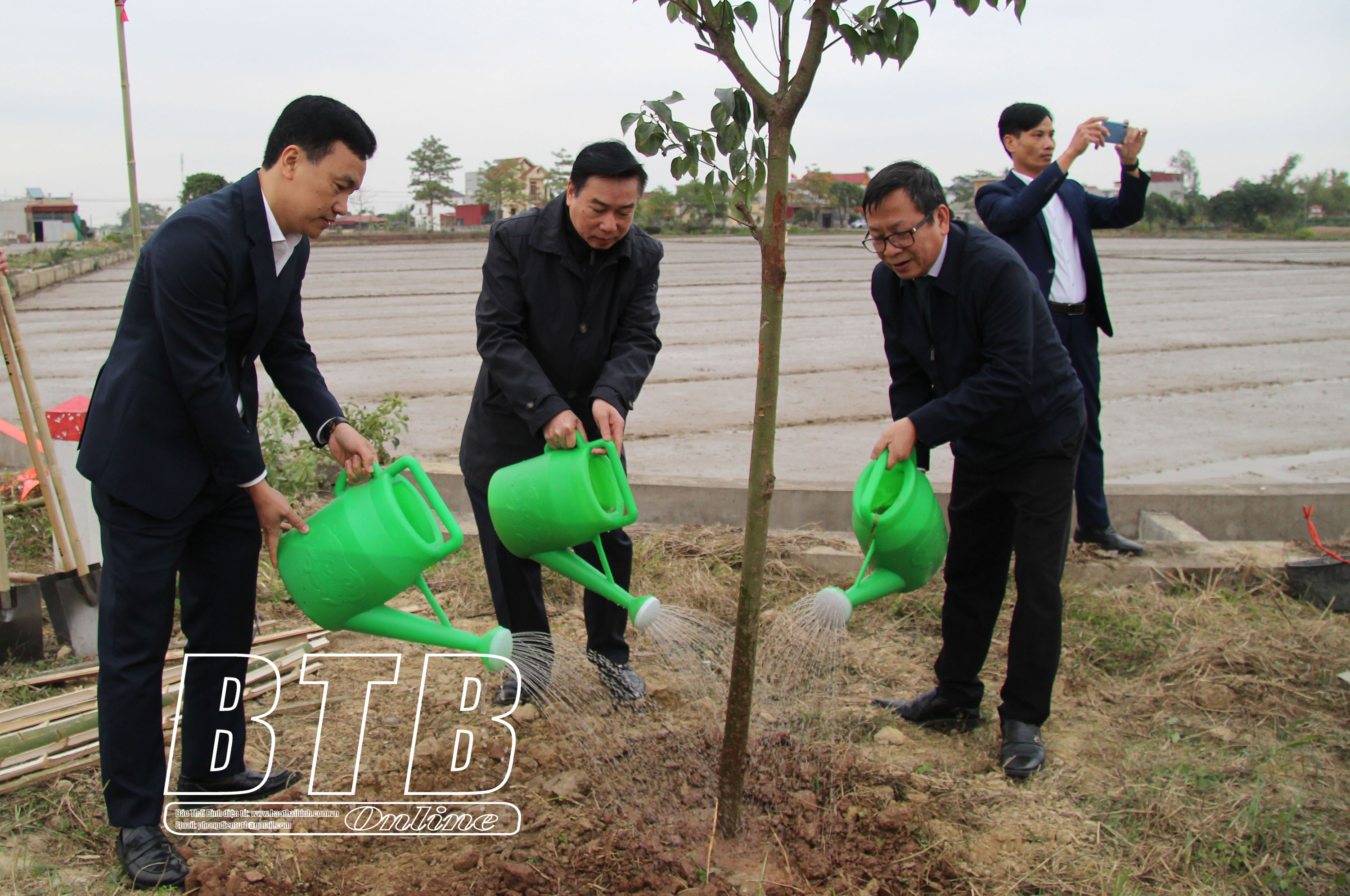 Các đồng chí lãnh đạo tỉnh, huyện Tiền Hải trồng cây xanh tại sân vận động thể thao xã Đông Hoàng. Ảnh: Trần Tuấn