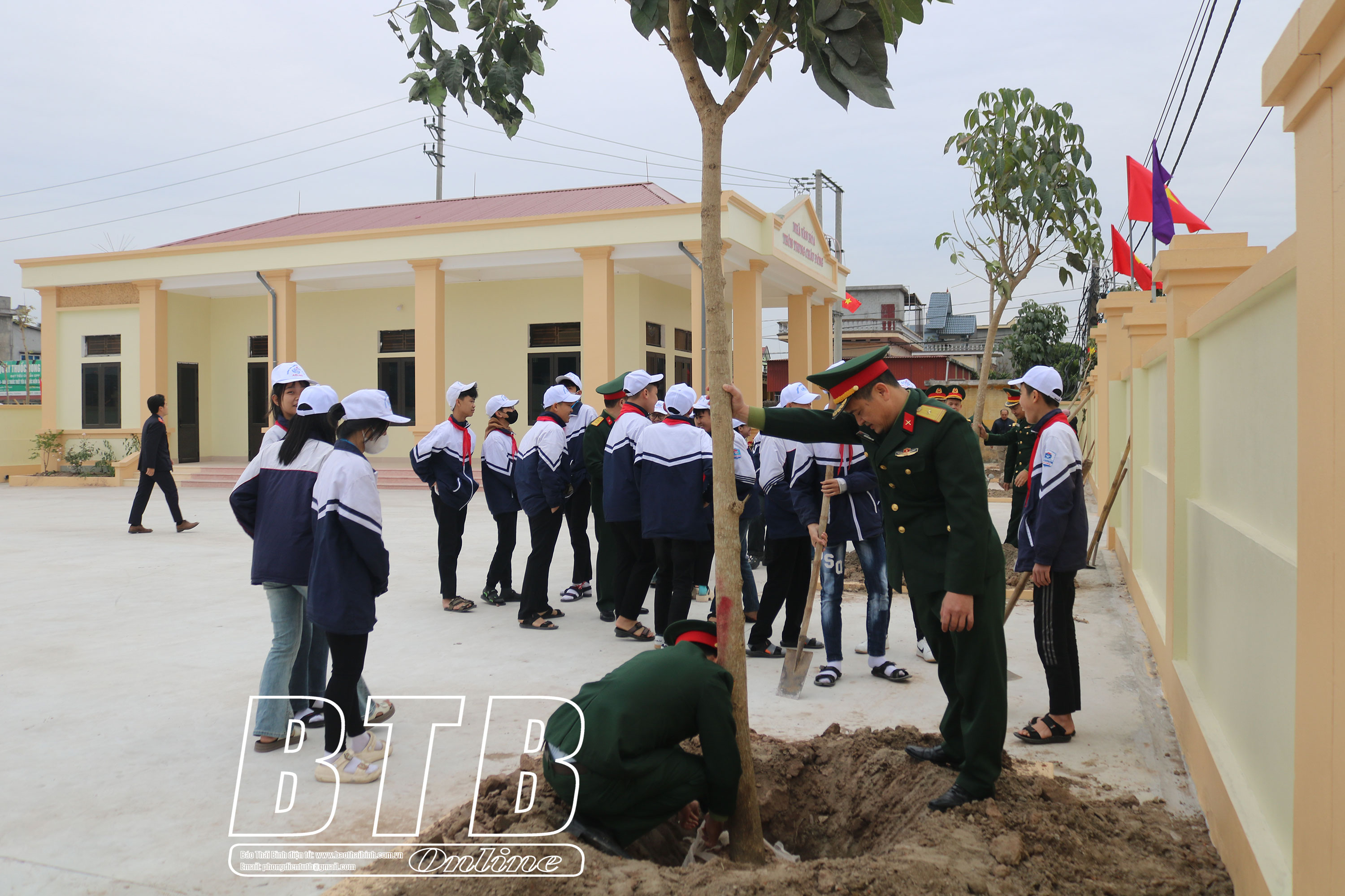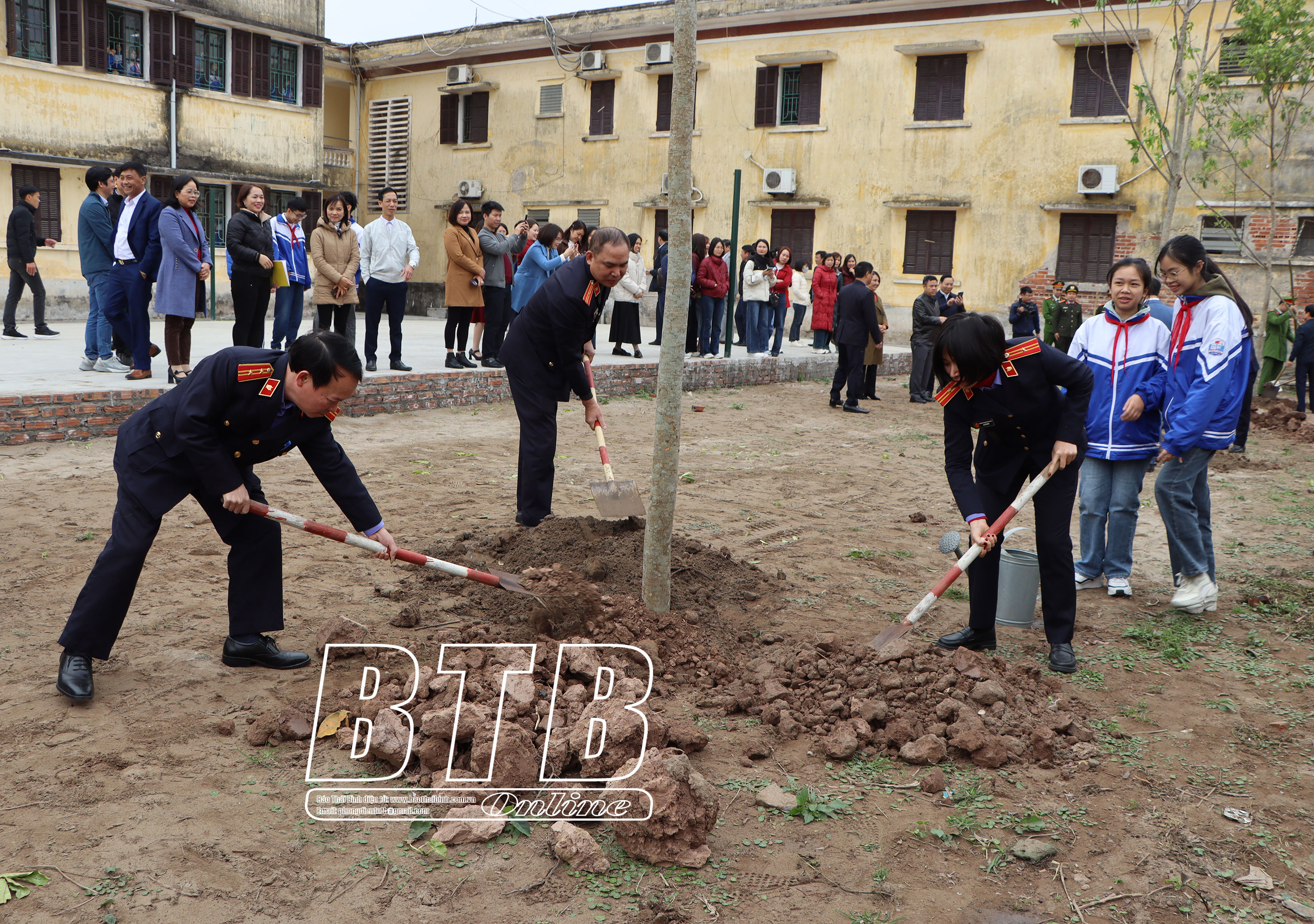 Cán bộ, chiến sĩ Ban Chỉ huy Quân sự huyện tham gia trồng cây xanh tại khuôn viên nhà trường. Ảnh: Thu Thủy