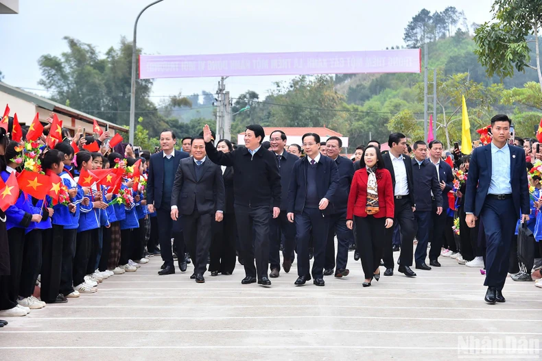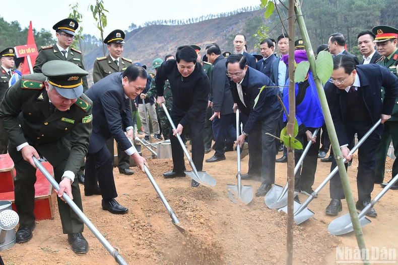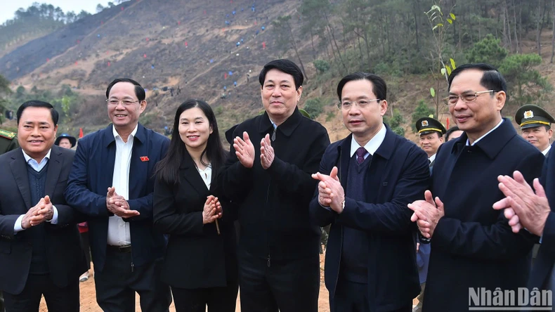 Sau khi đánh trống khai lễ phát động Tết trồng cây, Chủ tịch nước Lương Cường cùng các đại biểu, đại diện các tổ chức chính trị xã hội và đồng bào địa phương tham gia trồng cây tại khu vực đồi rừng tại xã Chiến Thắng, huyện Chi Lăng, tỉnh Lạng Sơn.