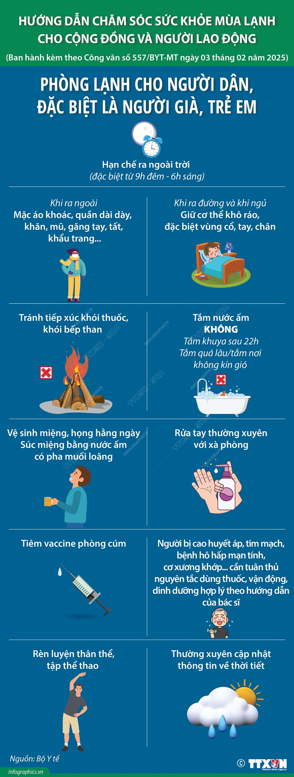 Hạn chế đi ra ngoài trời khi thời tiết quá lạnh và gió mạnh, đặc biệt trong khoảng thời gian từ 9h đêm đến 6h sáng. Khi ra ngoài thì nên trang bị đủ trang phục ấm che chắn được gió lùa như áo khoác, quần dài đủ dầy để giữ nhiệt, khăn choàng, mũ, găng tay, tất, khẩu trang... Luôn giữ cơ thể khô ráo, tránh bị ẩm ướt đặc biệt là vùng cổ, tay, chân mỗi khi ra đường và khi ngủ để hạn chế các bệnh do cảm lạnh… là những biện pháp dự phòng bảo vệ sức khoẻ mùa lạnh cho người dân, đặc biệt là người già và trẻ em.
