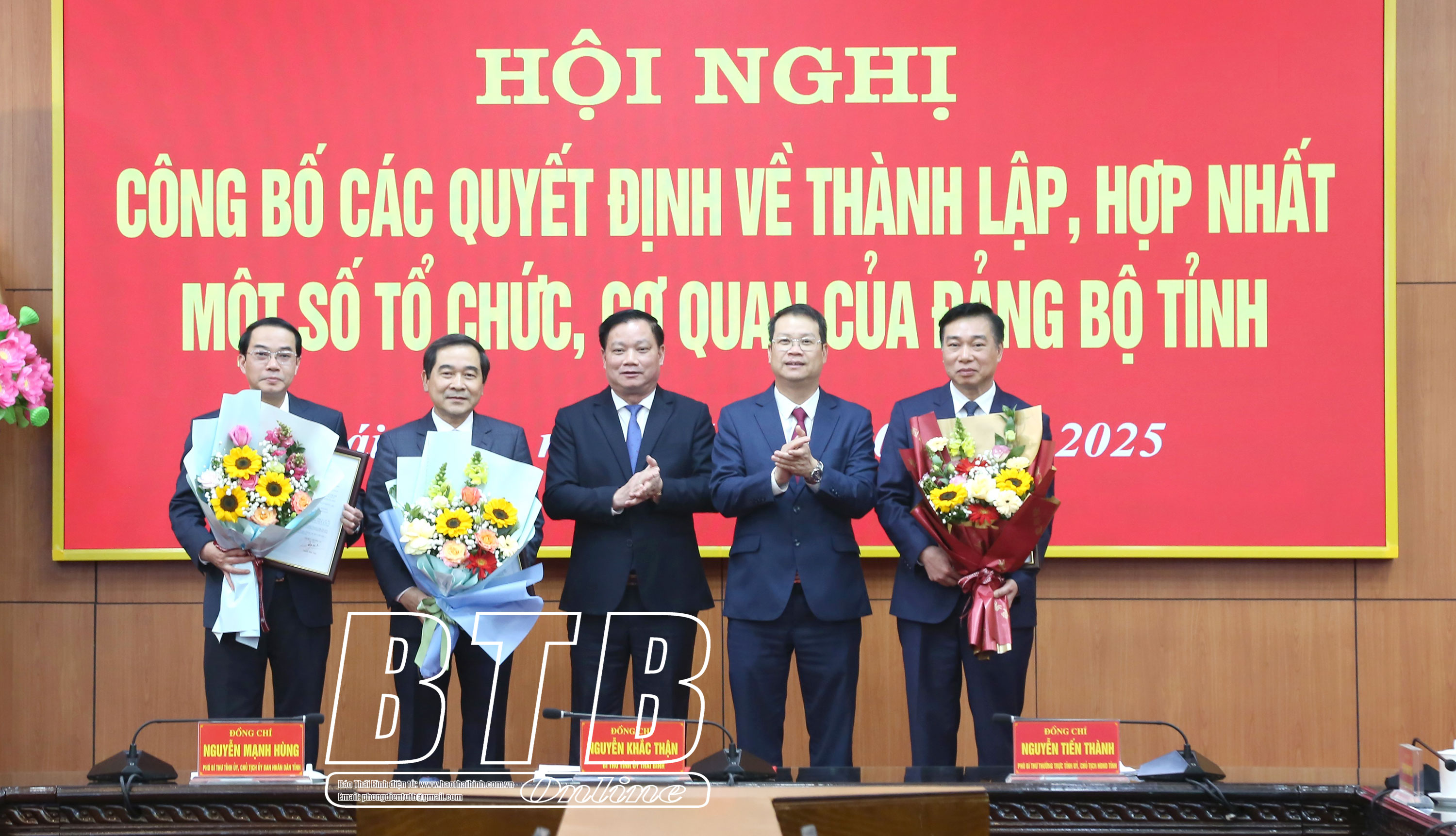Các đồng chí: Nguyễn Khắc Thận, Bí thư Tỉnh ủy; Nguyễn Tiến Thành, Phó Bí thư thường trực Tỉnh ủy, Chủ tịch HĐND tỉnh; Nguyễn Mạnh Hùng, Phó Bí thư Tỉnh ủy, Chủ tịch UBND tỉnh chủ trì hội nghị. Dự hội nghị có các đồng chí Ủy viên Ban Thường vụ Tỉnh ủy; các đồng chí thành viên đảng đoàn, ban cán sự đảng, các đảng ủy, cơ quan, đơn vị thuộc diện thành lập, hợp nhất, kết thúc hoạt động.
