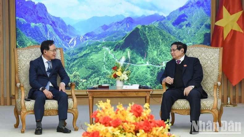 Thủ tướng Phạm Minh Chính tiếp Tổng giám đốc Samsung Việt Nam Choi Joo Ho chuẩn bị kết thúc nhiệm kỳ. (Ảnh: TRẦN HẢI).