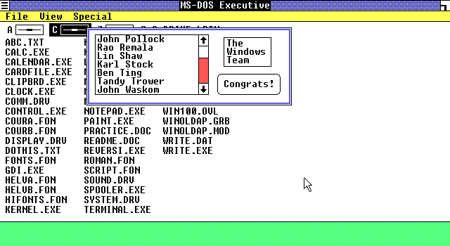 Chi tiết ẩn trên Windows 1.0 gồm tên các lập trình viên của hệ điều hành. Ảnh: Lucas Brooks.
