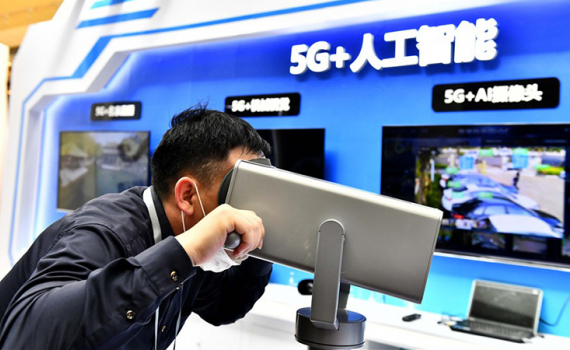 Một du khách trải nghiệm thiết bị 5G thông minh tại Hội nghị Thượng đỉnh về Đổi mới và Ứng dụng AI ở tỉnh Sơn Đông, Trung Quốc.