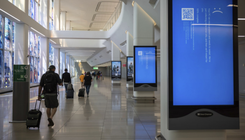Sự cố màn hình xanh xuất hiện trên màn hình quảng cáo tại một sân bay ở Mỹ. Ảnh: AP
