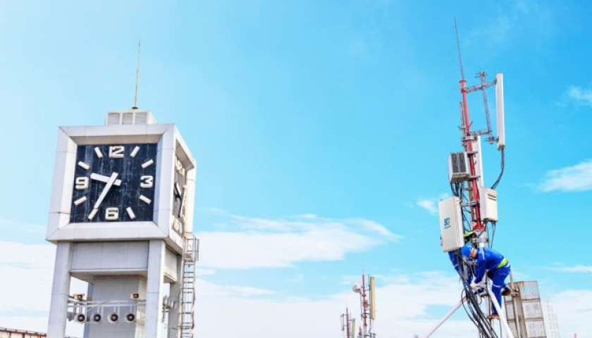 Kỹ thuật viên một nhà mạng đang lắp đặt trạm phát sóng 5G.