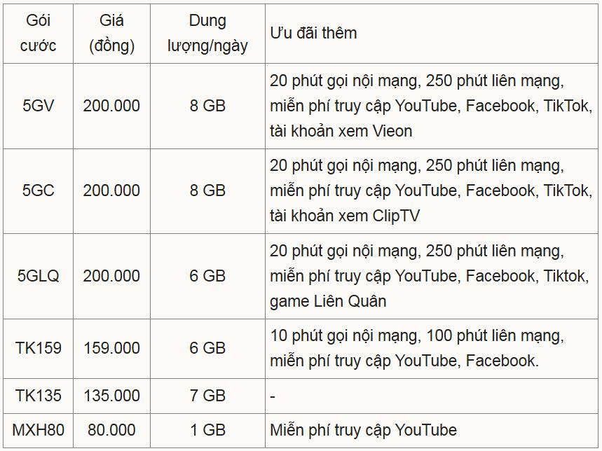 Trong ngày ra mắt 26/3, MobiFone giới thiệu 6 gói cước 5G, trong đó có ba gói 200.000 đồng/tháng, dung lượng 6-8 GB/ngày; gói 135.000 và 159.000 đồng với dung lượng 6-7 GB/ngày. Đây cũng là nhà mạng đầu tiên đưa ra gói cước tháng thấp nhất 80.000 đồng, dung lượng 1 GB/ngày, miễn phí truy cập YouTube. Ngoài ra, người dùng cũng có thể dùng thử gói TN5G, được 30 GB miễn phí trong 15 ngày.