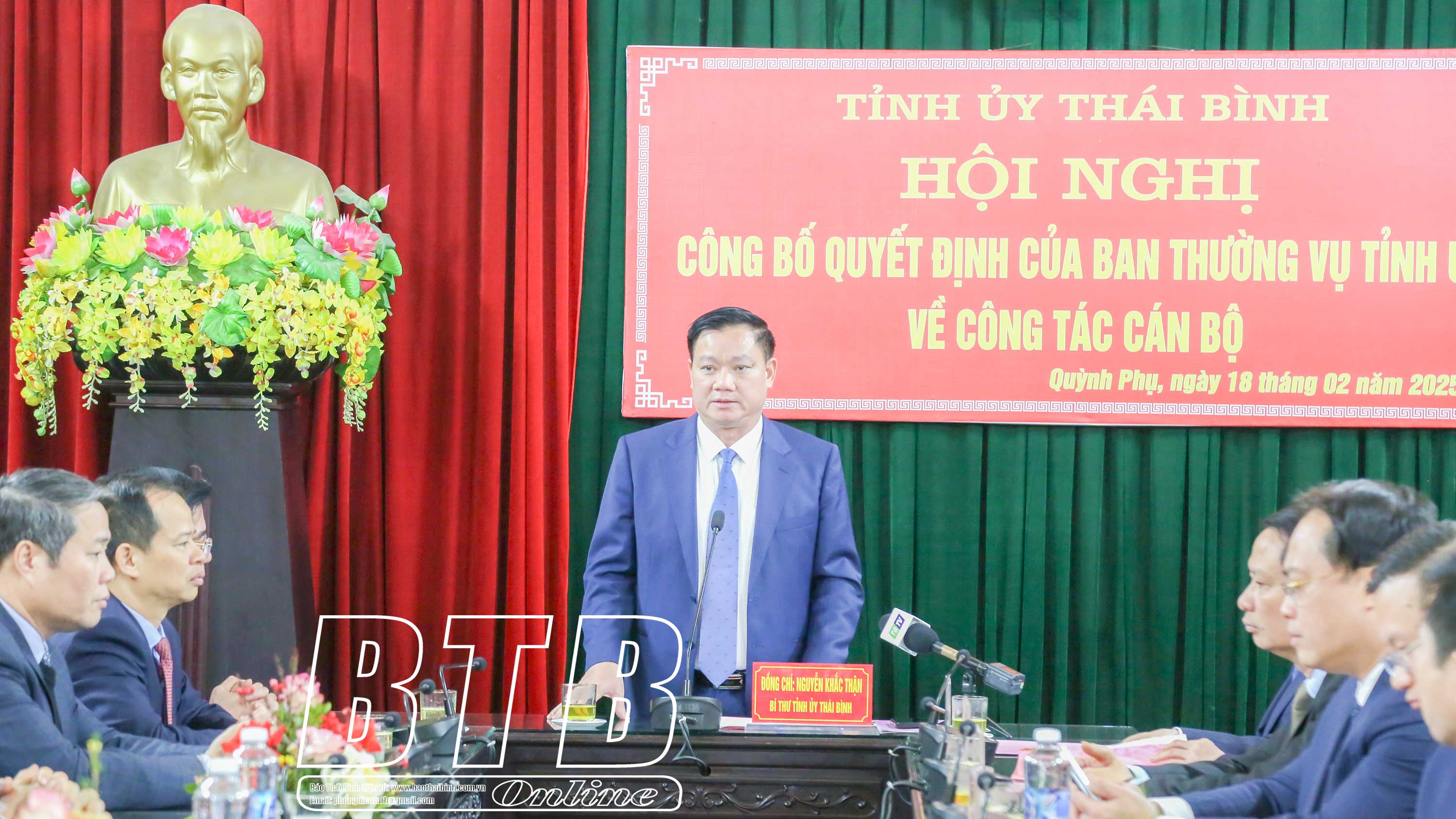Trao quyết định, tặng hoa đồng chí Nguyễn Tiến Quyền, đồng chí Nguyễn Khắc Thận, Bí thư Tỉnh ủy phát biểu chúc mừng Đảng bộ huyện Quỳnh Phụ và cá nhân đồng chí tân Bí thư Huyện ủy, đồng thời nhấn mạnh Ban Thường vụ Tỉnh ủy đã nghiên cứu, cân nhắc rất kỹ lưỡng, đánh giá cao trình độ, năng lực, kinh nghiệm lãnh đạo của đồng chí Nguyễn Tiến Quyền.