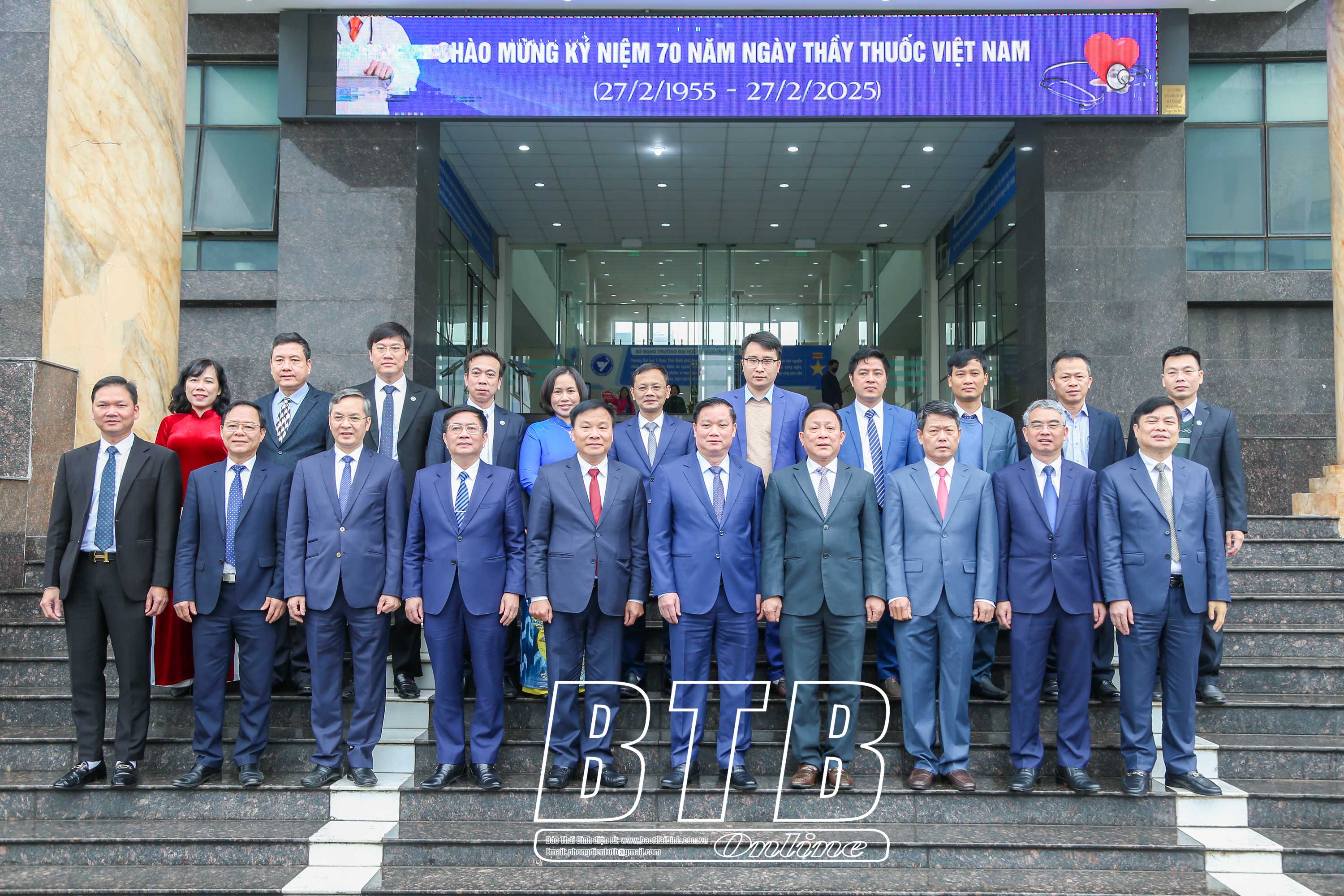 Đồng chí Nguyễn Khắc Thận, Bí thư Tỉnh ủy cùng các đồng chí lãnh đạo tỉnh chụp ảnh lưu niệm với Ban giám hiệu Trường Đại học Y Dược Thái Bình.