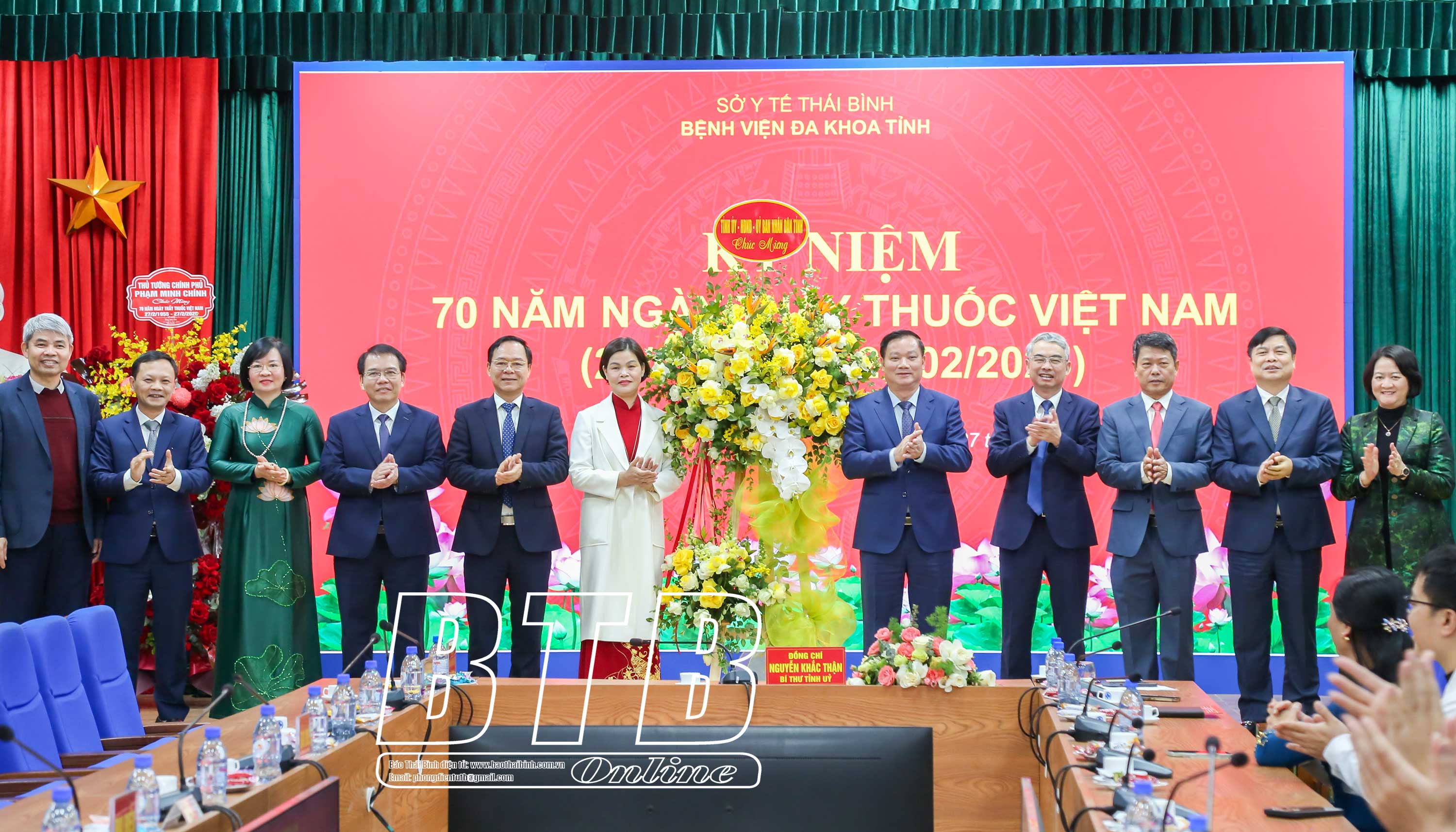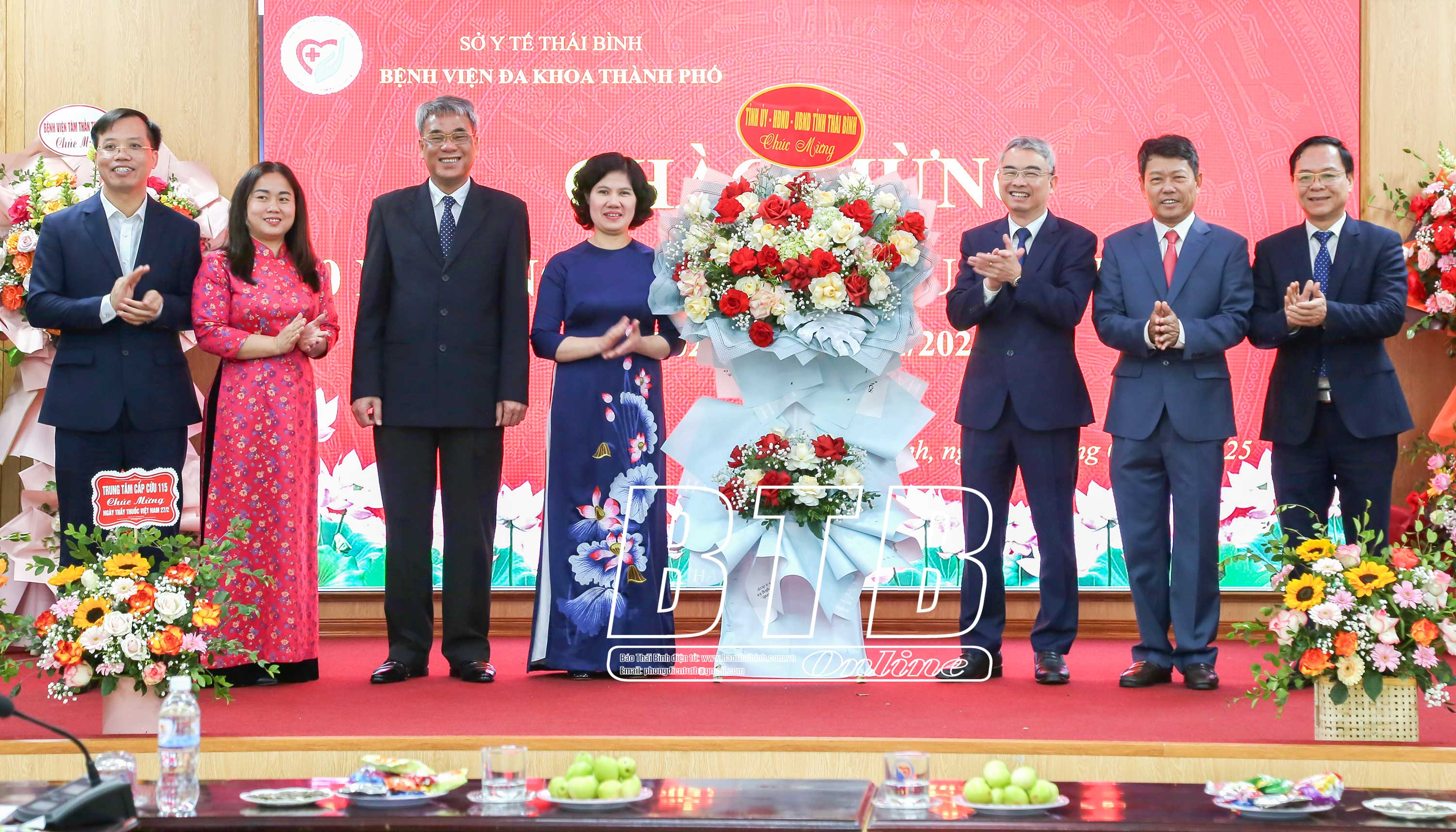 Các đồng chí: Phạm Đồng Thụy, Ủy viên Ban Thường vụ, Trưởng ban Tuyên giáo và Dân vận Tỉnh ủy; Hoàng Văn Thành, Ủy viên Ban Thường vụ, Bí thư Thành uỷ, Chủ tịch HĐND thành phố tặng hoa chúc mừng Bệnh viện Đa khoa thành phố Thái Bình.