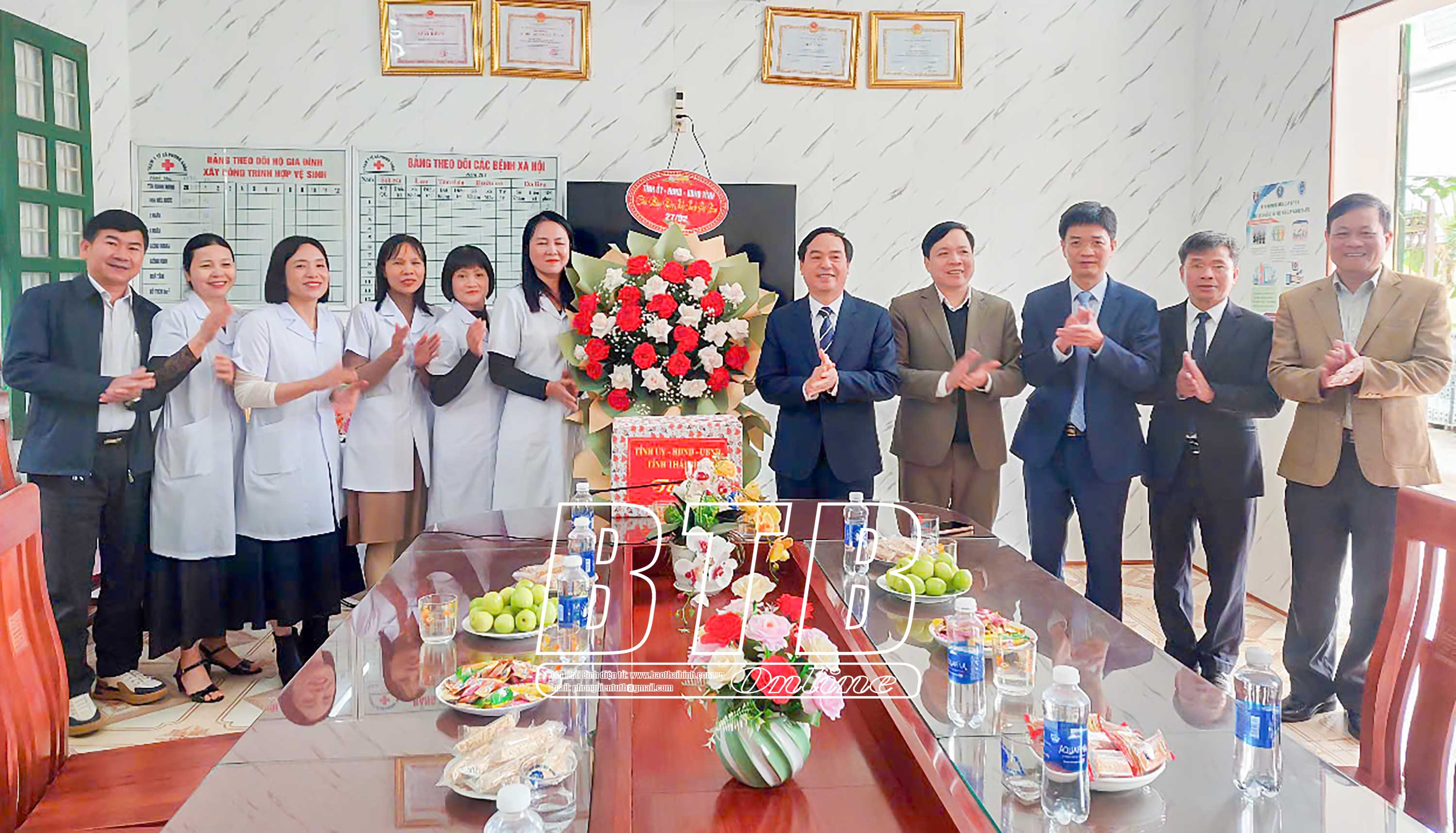 Đồng chí Vũ Ngọc Trì, Tỉnh ủy viên, Phó Chủ tịch HĐND tỉnh cùng các đồng chí lãnh đạo tỉnh tặng quà chúc mừng tập thể cán bộ, y bác sĩ Trạm Y tế Phong Châu, xã Phong Dương Tiến (Đông Hưng).