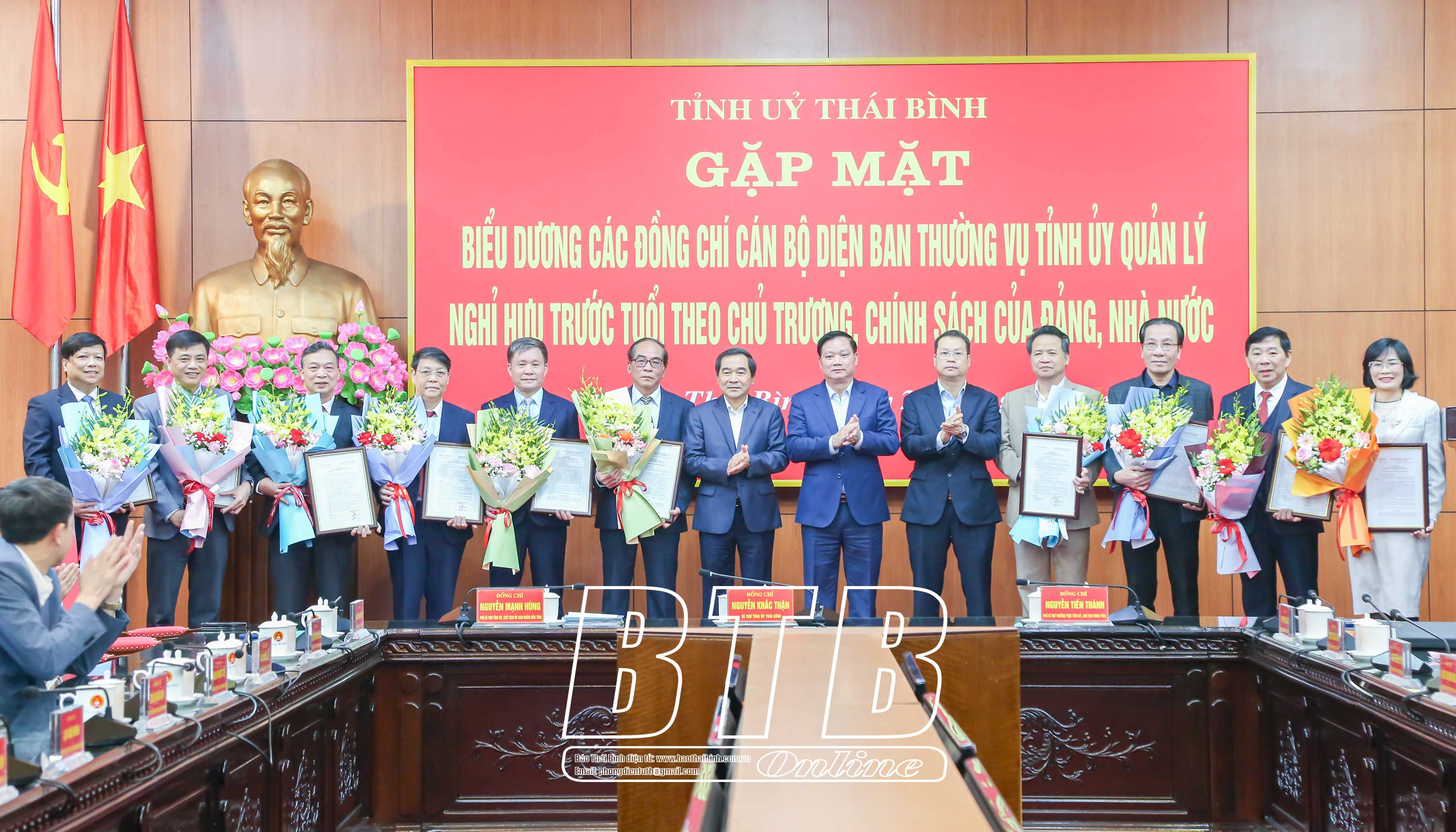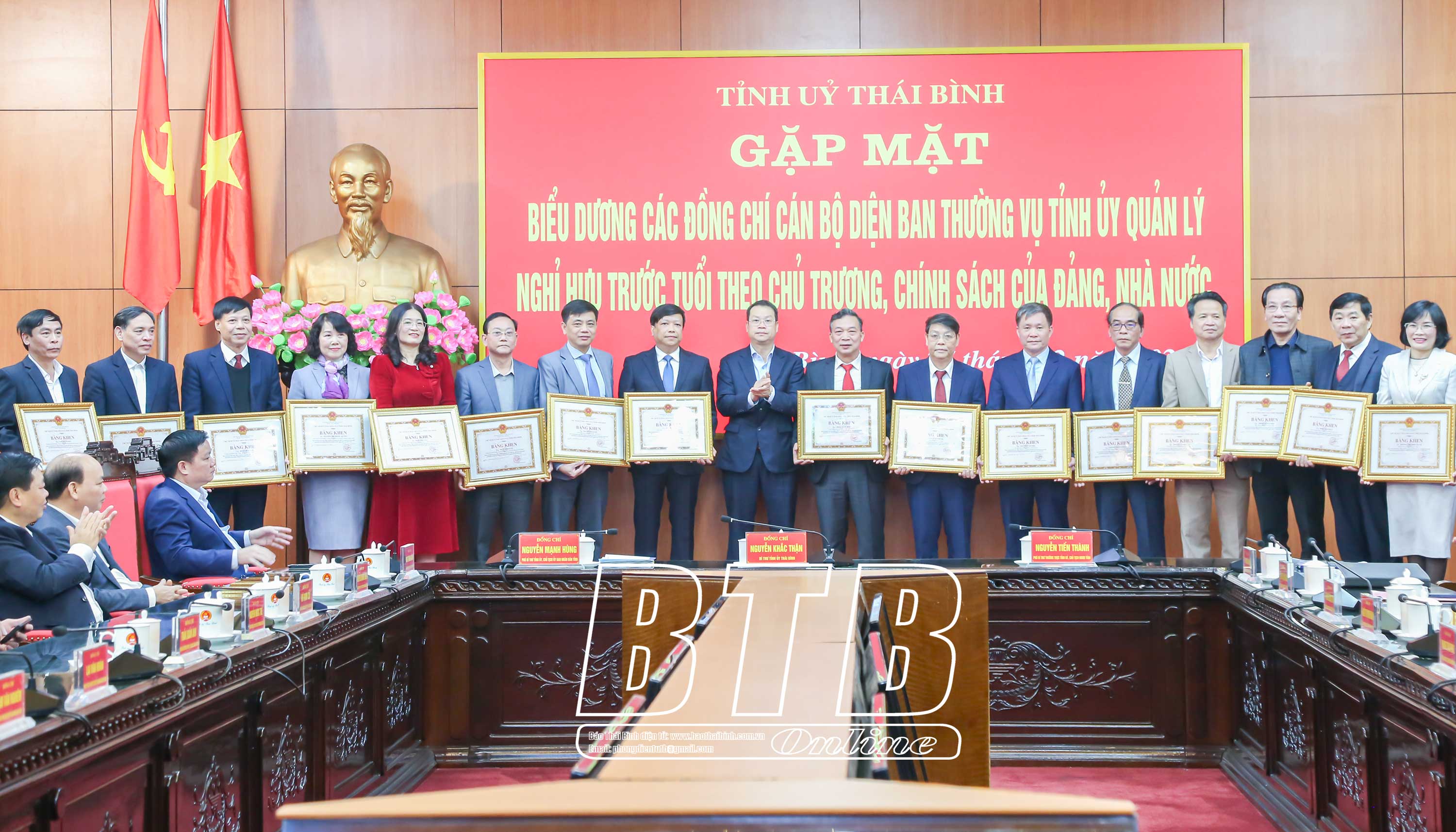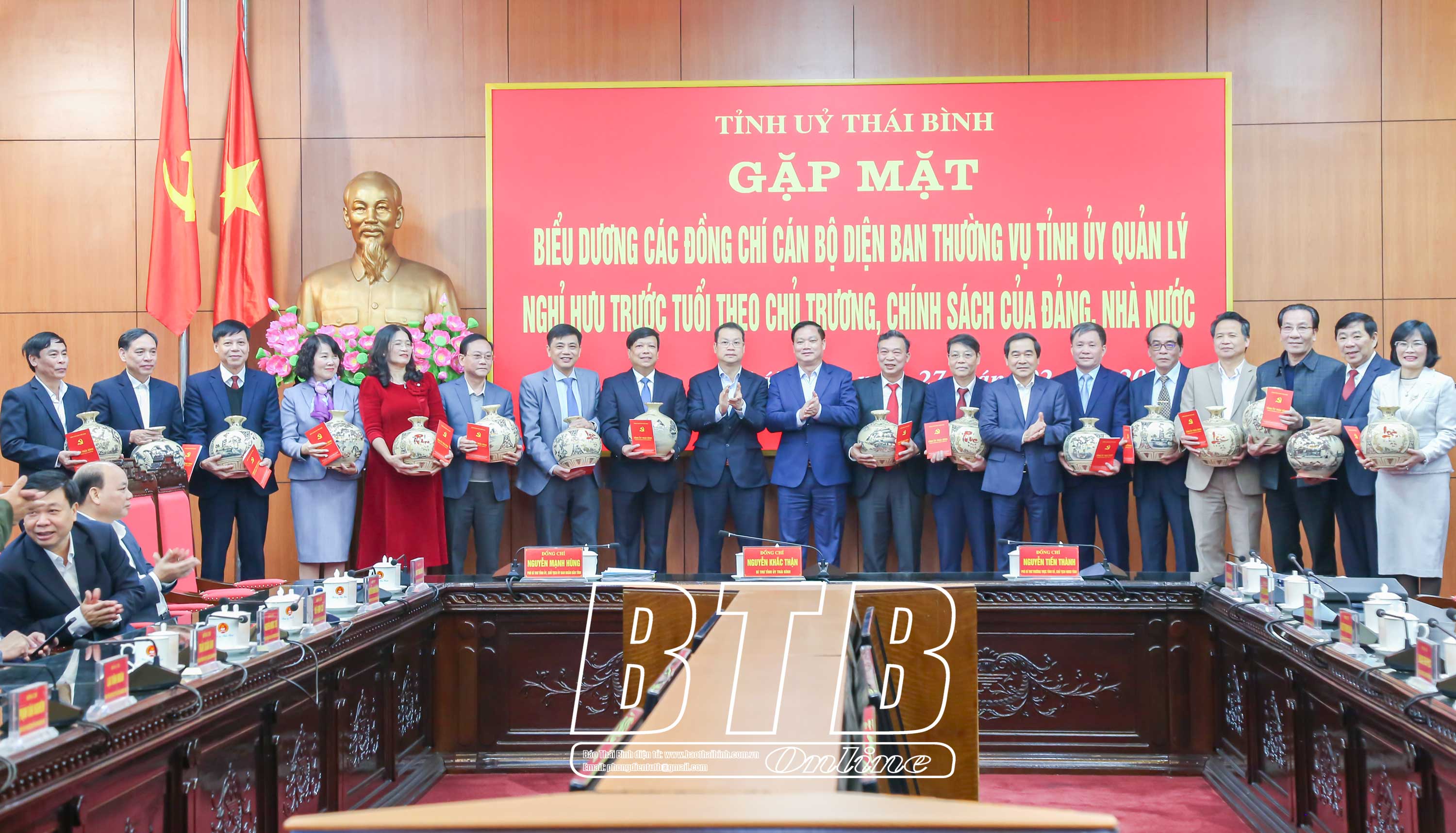 Tại buổi gặp mặt, các đồng chí Thường trực Tỉnh ủy đã trao các quyết định nghỉ hưu, tặng hoa chúc mừng và quà lưu niệm, đồng thời trao bằng khen của UBND tỉnh cho 17 đồng chí cán bộ diện Ban Thường vụ Tỉnh ủy quản lý do có thành tích tiêu biểu đi đầu, tự nguyện viết đơn xin nghỉ hưu trước tuổi, góp phần xây dựng hệ thống chính trị tinh gọn, phục vụ nhân dân.