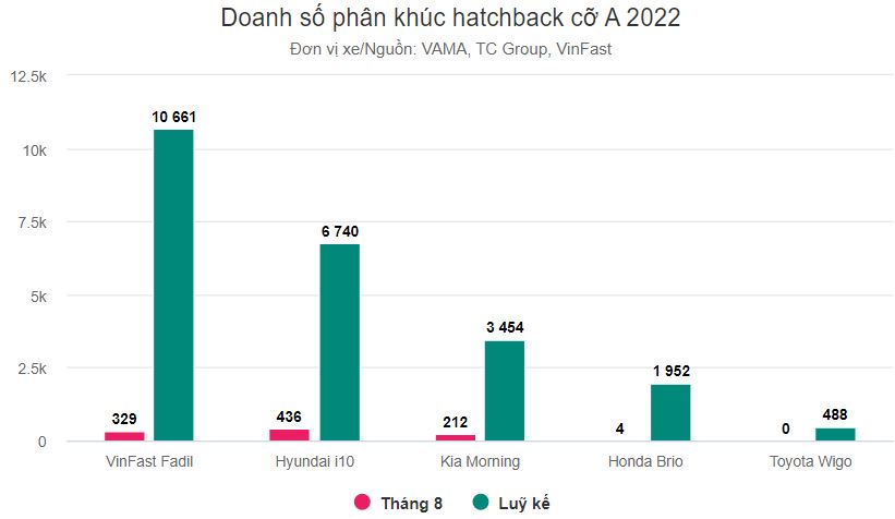 Fadil bị khai tử từ giữa tháng 7, hãng không nhận đặt hàng xe mới, thay vào đó tập trung trả các đơn hàng chưa kịp giao cho khách. So với tháng 7, doanh số Fadil giảm 58%. Đối thủ Hyundai i10 cũng giảm doanh số nhưng ít hơn Fadil, ở mức 32%.