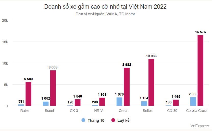 Sau 10 tháng 2022, mẫu xe của Toyota đạt 16.576 xe bán ra, dẫn đầu phân khúc xe gầm cao cỡ nhỏ (dưới cỡ C) dù là mẫu xe đắt và kích thước lớn nhất. Đối thủ đồng hạng với Corolla Cross là Mazda CX-30, chung nguồn gốc nhập khẩu Thái Lan, lượng bán chỉ hơn 1.400 xe, không bằng một tháng doanh số của Corolla Cross (trung bình hơn 1.600 xe/tháng).