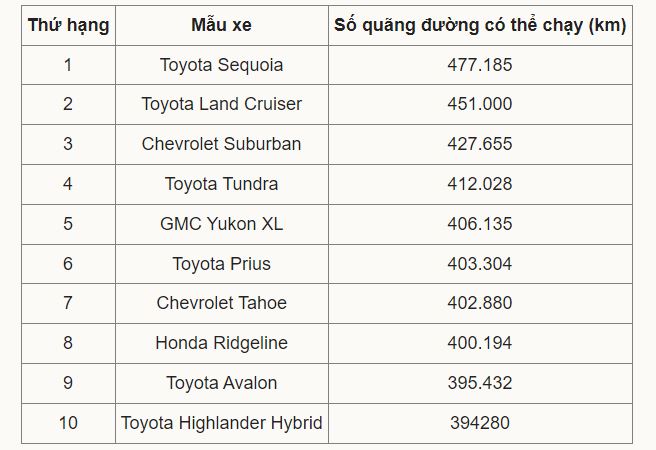 Hai vị trí đầu tiên đều là Toyota, với mẫu SUV cỡ lớn Sequoia chiếm ngôi quán quân. Cụ thể, có 1% số xe Sequoia được xác định chạy ít nhất 477.185 km. Đứng thứ hai là Land Cruiser. Cả hai mẫu xe của Toyota đều nhiều lần thay nhau chiếm những vị trí cao nhất trong xếp hạng của iSeeCars.