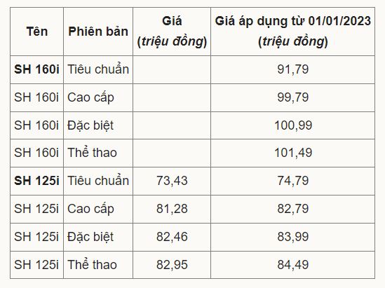 Theo kế hoạch, Honda SH 160i/125i bán ra từ ngày 22/12/2022, cả hai đều có 4 phiên bản, giá cụ thể như bảng dưới. Mức giá từ 2023 tăng khoảng 1,5 triệu so với các bản hiện nay.