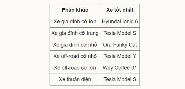 Tesla đóng góp hai cái tên trong danh sách, với Model S giành tới hai chiến thắng: xe gia đình cỡ trung và xe thuần điện tốt nhất, trong khi Model Y là xe off-road cỡ nhỏ tốt nhất. Mẫu xe điện đến từ Hàn Quốc, Hyundai Ioniq 6, là xe tốt nhất ở phân khúc xe gia đình cỡ lớn.