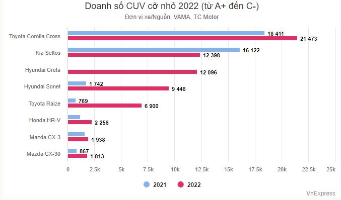 Tất cả các mẫu xe trong nhóm CUV cỡ nhỏ (từ A+ đến C-) đều tăng doanh số so với 2021, trừ Seltos. Sự xuất hiện của Creta với tầm giá thấp hơn đôi chút, khó khăn về nguồn cung từ giai đoạn đầu 2022 khiến mẫu xe bán chạy nhất của Kia giảm doanh số.