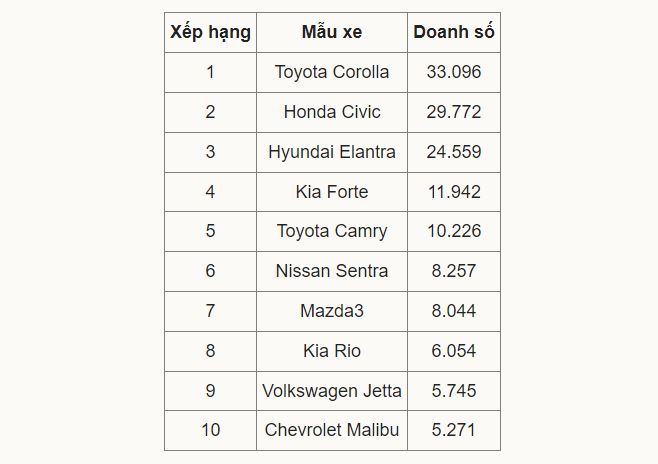 Lần lượt ở những vị trí tiếp theo của top 5 bảng xếp hạng doanh số xe mới 2022 tại Canada là Hyundai Elantra, Kia Forte, và Toyota Camry. Phần còn lại của top 10 gồm Nissan Sentra, Mazda3, Kia Rio, Volkswagen Jetta và Chevrolet Malibu.
