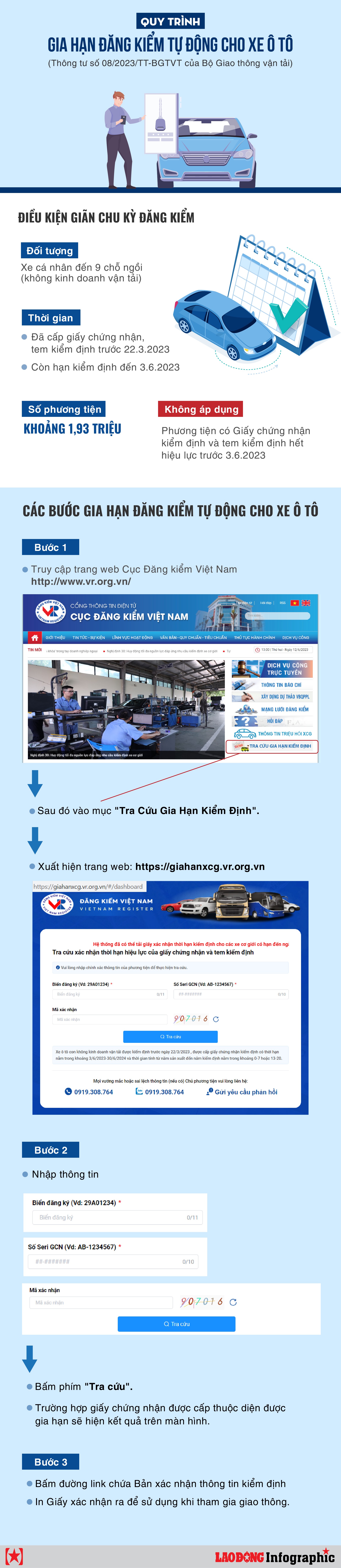 Theo Thông tư số 08/2023/TT-BGTVT của Bộ Giao thông vận tải về việc tự động gia hạn đăng kiểm, từ 3.6, chủ xe ô tô chở người đến 9 chỗ, không kinh doanh vận tải có thể tự tra cứu thông tin và in giấy xác nhận thời hạn hiệu lực của giấy chứng nhận, tem kiểm định.