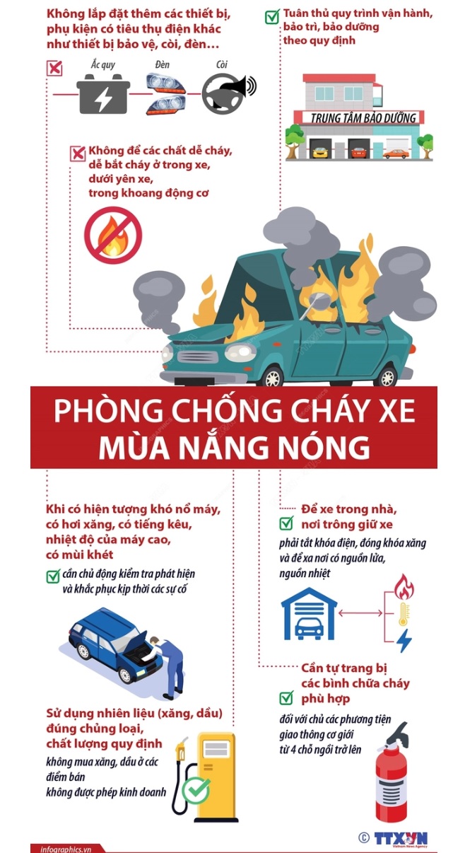 Thời tiết nắng nóng, ôtô vận hành liên tục trong nhiều giờ mà không được nghỉ để làm mát hợp lý, hoặc lỗi kỹ thuật, tác động bên ngoài đều có thể khiến xe bắt lửa ở một điểm và nhanh chóng lan ra cả xe. Để bảo đảm an toàn phòng cháy và chữa cháy cho ô tô, xe máy, Cục Phòng cháy, chữa cháy và cứu nạn cứu hộ khuyến cáo mỗi người sử dụng phương tiện cần thực hiện các biện pháp phòng cháy, chữa cháy.