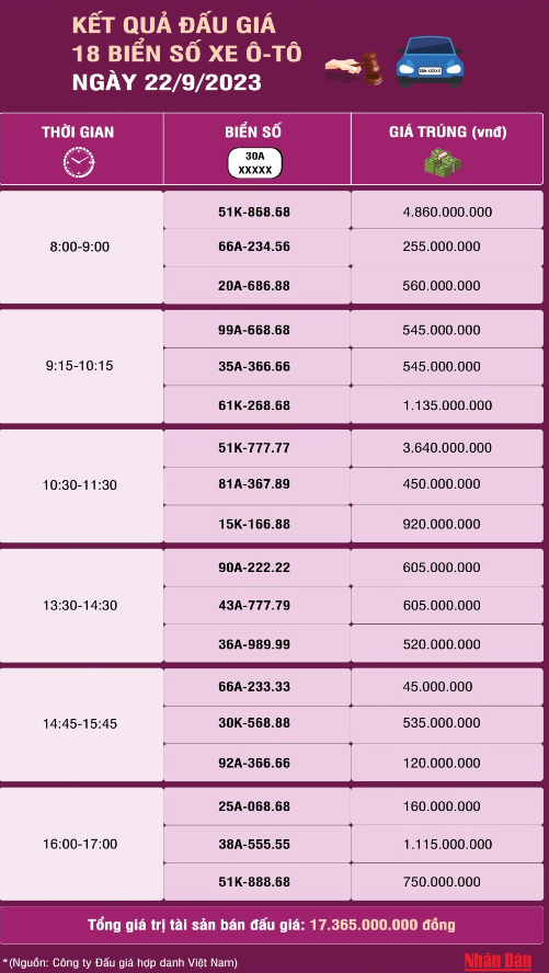 Theo công bố của Công ty Đấu giá hợp danh Việt Nam, trong phiên đấu giá 18 biển số xe ô-tô ngày 22/9/2023, giá trúng đấu giá cao nhất là 4.860.000.000 đồng, giá trúng đấu giá thấp nhất là 45.000.000 đồng.
