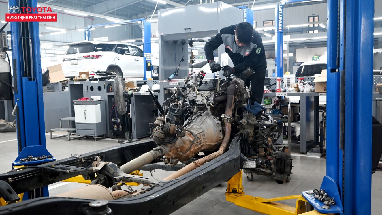 Xưởng sửa chữa chung được trang bị máy chỉnh độ chụm 3D hiện đại nhất thị trường với camera kỹ thuật số, có độ chính xác cao, cân chỉnh xe chỉ trong 10 phút; máy chẩn đoán của hãng Toyota đọc, chẩn đoán và xóa tất cả lỗi trên xe; 07 cầu nâng hiện đại cùng các trang thiết bị và công cụ được đầu tư mới và hiện đại nhất thị trường hiện nay.