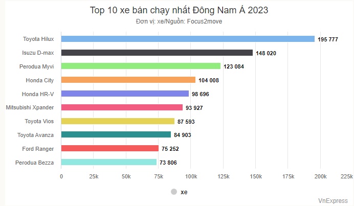 Dữ liệu của Focus2move thống kê 10 mẫu xe bán chạy nhất khu vực Đông Nam Á trong năm vừa qua. Doanh số được lấy từ 9 thị trường là Thái Lan, Philippines, Việt Nam, Indonesia, Malaysia, Brunei, Lào, Myanmar và Campuchia.