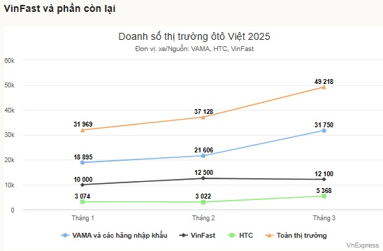 Tháng 3, doanh số của VinFast đạt hơn 12.100 xe. Không một hãng đối thủ nào đạt đến ngưỡng bán này, dù tính tổng cộng cả quý. Với 34.600 xe bán ra trong quý đầu, VinFast tạo ra khoảng cách tới 23.200 xe với đối thủ xếp gần nhất, Toyota, con số gấp gần 6 lần lượng bán trung bình tháng của hãng Nhật.