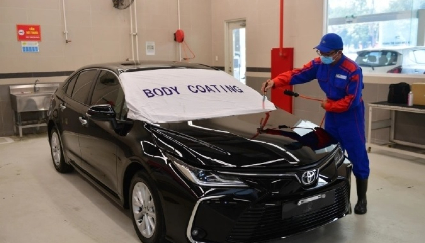 Nhân viên thực hiện vệ sinh và phủ bóng ngoại thất bằng sản phẩm chuyên dụng tại Toyota Hiroshima Tân Cảng. Ảnh: Capco