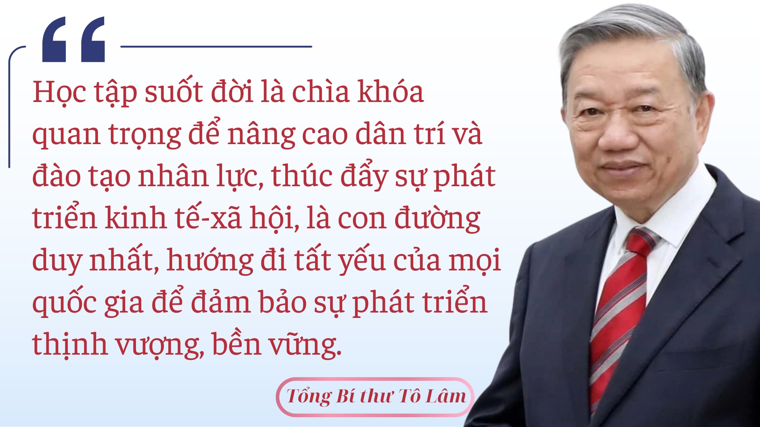 Chúng ta đang sống trong thời đại mà tri thức, kiến thức, hiểu biết sẽ giúp con người phát huy cao độ tiềm năng để tận dụng tốt các cơ hội, ứng phó hiệu quả với những thách thức để phát triển bền vững; cũng là thời đại mà khối lượng kiến thức của nhân loại tăng lên hằng ngày theo cấp số nhân. Chỉ khi toàn Đảng, toàn dân, toàn quân, nhà nhà, người người thực hiện hiệu quả học tập suốt đời, xây dựng được đội ngũ cán bộ dám làm, dám nói, dám chịu trách nhiệm, dám hy sinh, chúng ta mới vững vàng tiến vào kỷ nguyên mới, kỷ nguyên phát triển, giàu mạnh dưới sự lãnh đạo của Đảng.