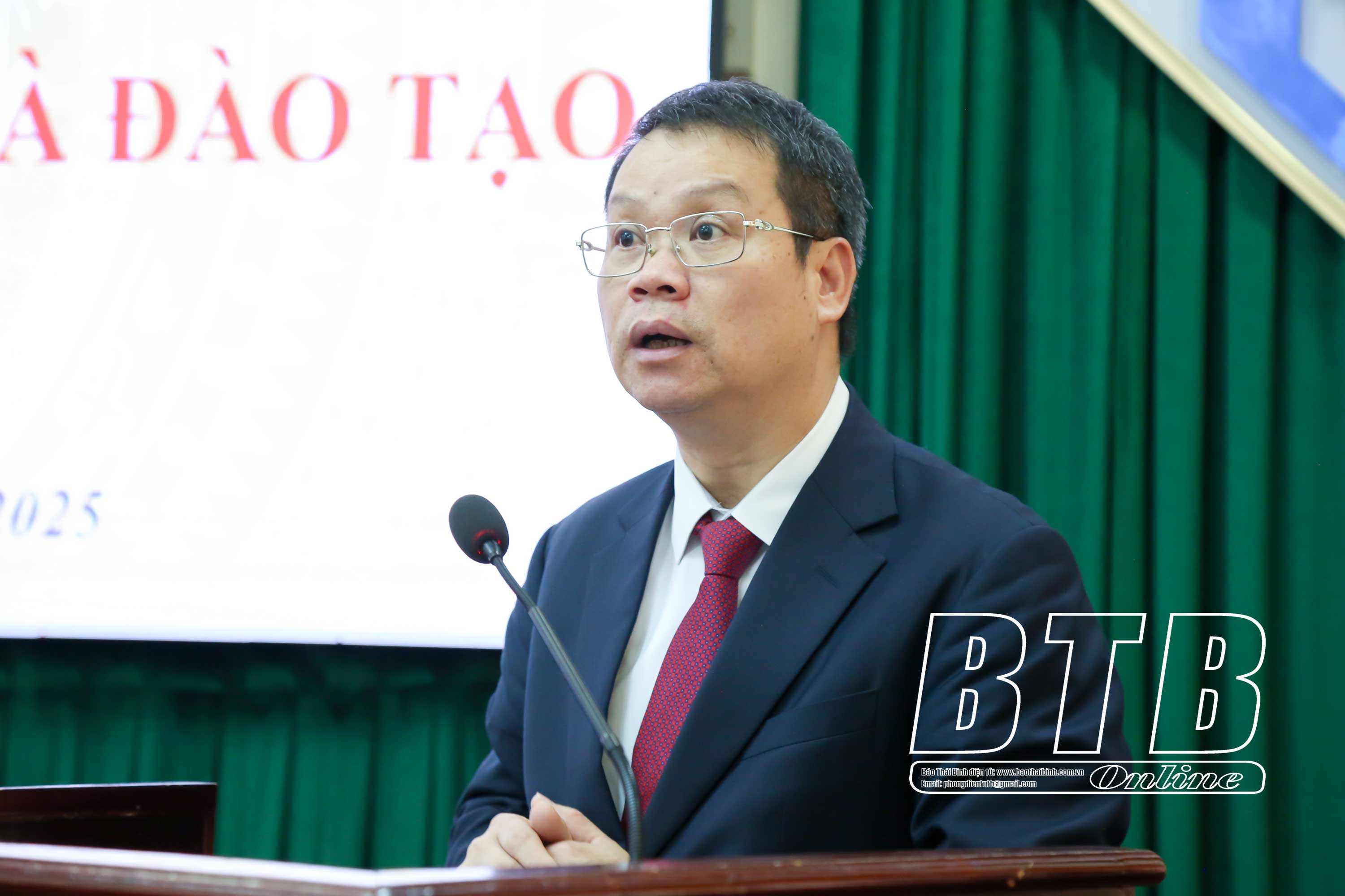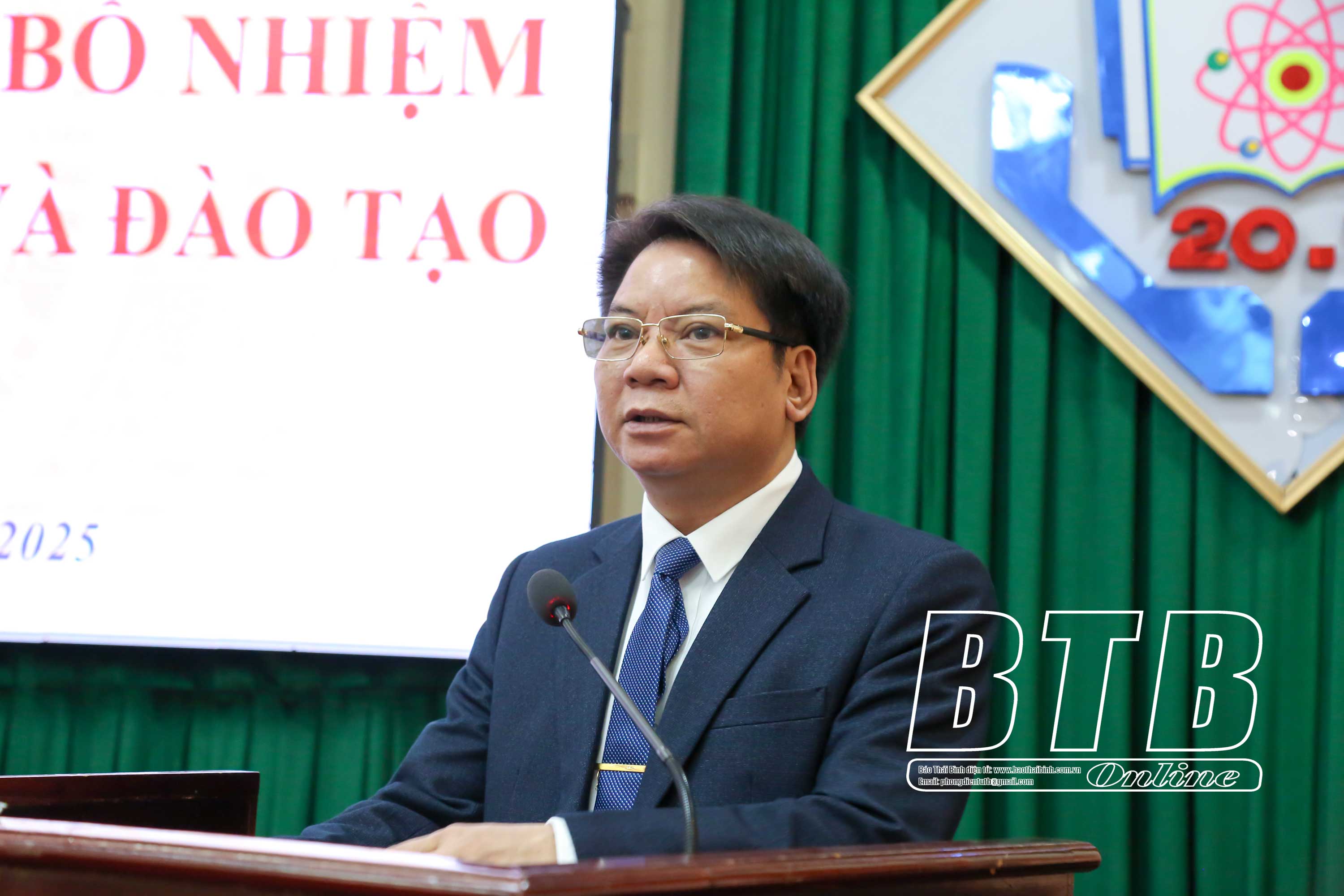 Trao quyết định, tặng hoa chúc mừng tân Giám đốc Sở Giáo dục và Đào tạo, đồng chí Nguyễn Mạnh Hùng, Phó Bí thư Tỉnh ủy, Chủ tịch UBND tỉnh nhấn mạnh vai trò quan trọng của ngành giáo dục trong phát triển kinh tế - xã hội của tỉnh; đề nghị Sở Giáo dục và Đào tạo, đồng chí tân Giám đốc Sở tập trung nghiên cứu các chính sách, quy định của Đảng, Nhà nước về lĩnh vực giáo dục và thực tiễn của tỉnh để kịp thời tham mưu UBND tỉnh sắp xếp, tinh gọn bộ máy của ngành theo tinh thần Nghị quyết số 18-NQ/TW, ngày 25/10/2017 của Ban Chấp hành Trung ương Đảng khóa XII; tập trung triển khai thực hiện hiệu quả các nghị quyết của Bộ Chính trị, Chính phủ, chương trình hành động của Ban Thường vụ Tỉnh ủy, kế hoạch của UBND tỉnh về đột phá phát triển khoa học, công nghệ, đổi mới sáng tạo và chuyển đổi số quốc gia; xây dựng kế hoạch thực hiện đánh giá ngoài kiểm định chất lượng giáo dục và công nhận trường đạt chuẩn quốc gia, việc thực hiện chỉ đạo của Bộ Chính trị về miễn học phí cho học sinh từ mầm non đến hết THPT công lập; sớm tham mưu triển khai thực hiện quy định về dạy thêm, học thêm; tập trung chỉ đạo tổ chức thành công kỳ thi tốt nghiệp THPT năm 2025, kỳ thi tuyển sinh vào lớp 10 THPT năm học 2025 - 2026...