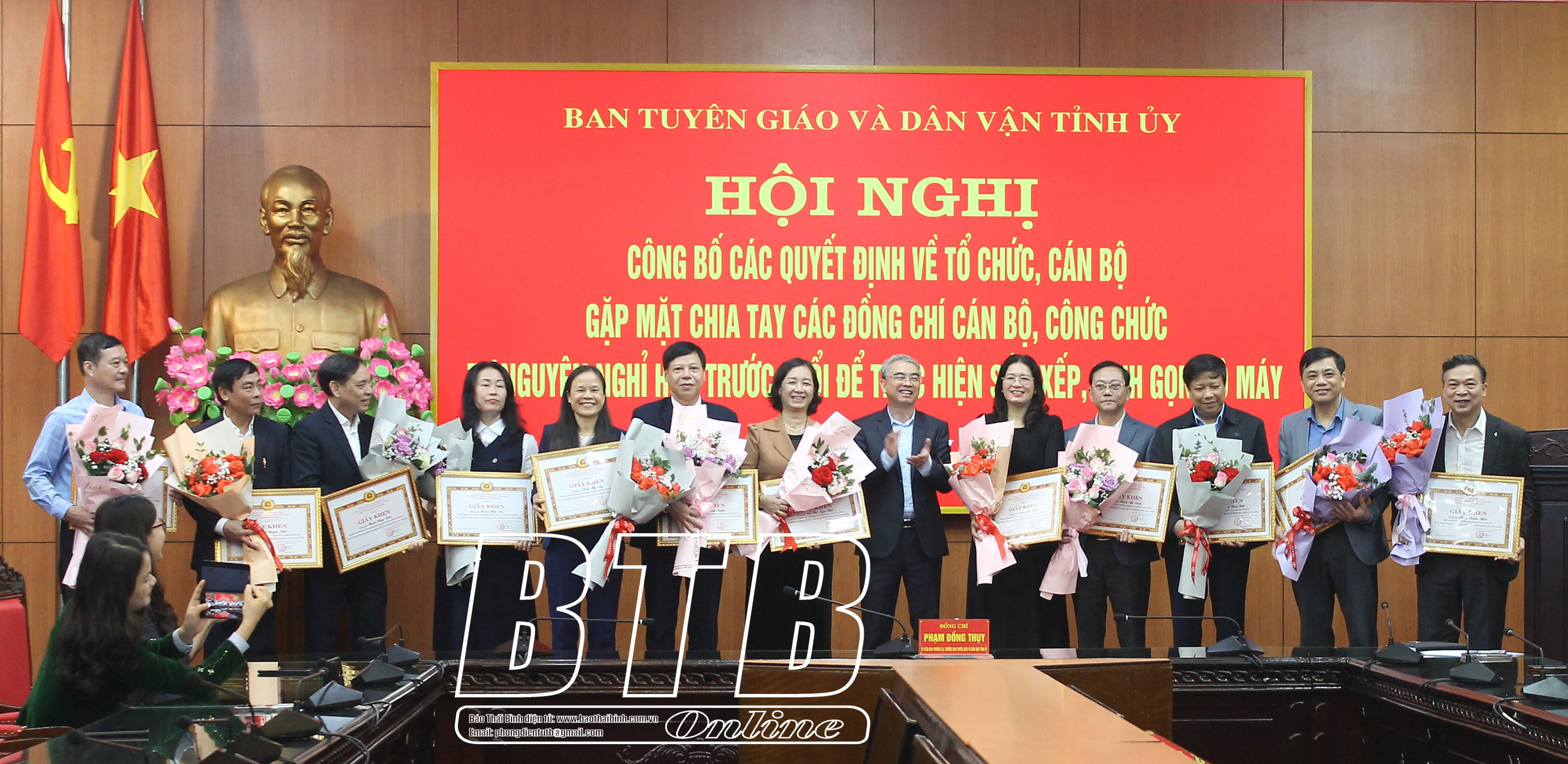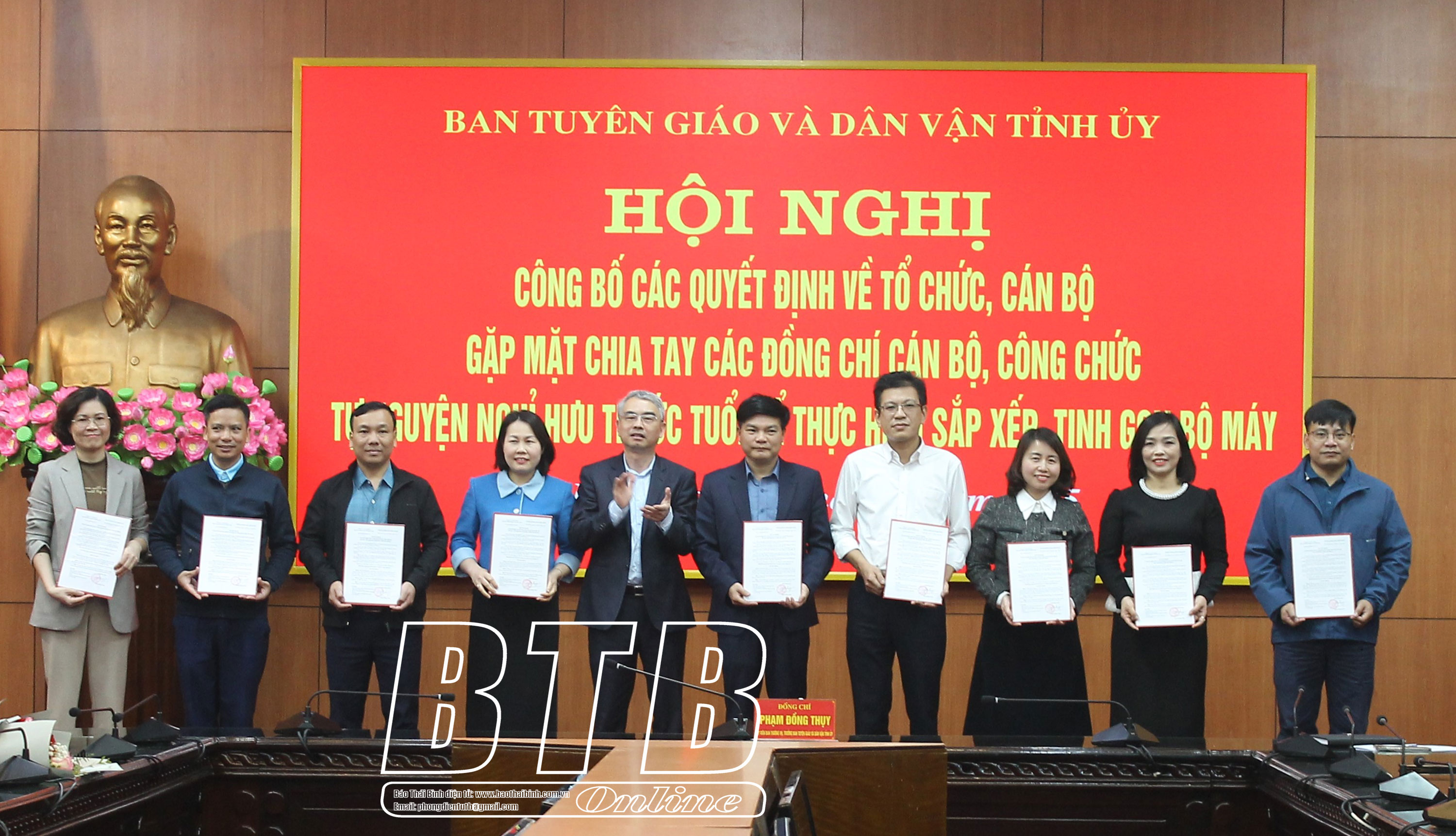 Sáng ngày 3/3, Ban Tuyên giáo và Dân vận Tỉnh ủy tổ chức hội nghị công bố các quyết định về tổ chức, cán bộ; gặp mặt, chia tay các đồng chí cán bộ, công chức tự nguyện nghỉ hưu trước tuổi để thực hiện sắp xếp, tinh gọn bộ máy. Đồng chí Phạm Đồng Thụy, Ủy viên Ban Thường vụ, Trưởng ban Tuyên giáo và Dân vận Tỉnh ủy chủ trì hội nghị.
