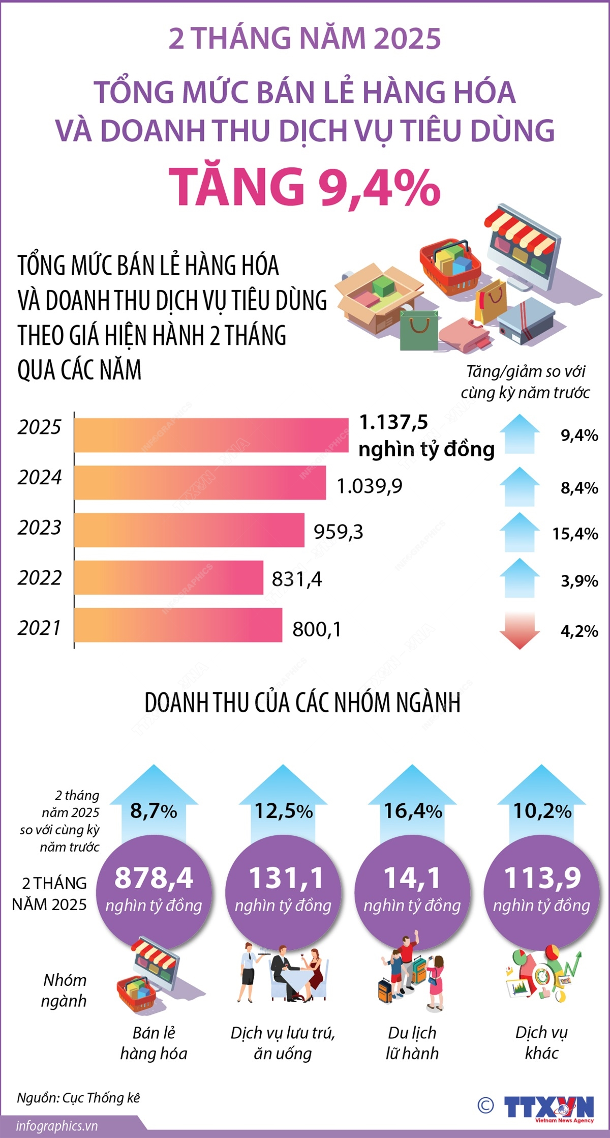 2 tháng năm 2025, tổng mức bán lẻ hàng hóa và doanh thu dịch vụ tiêu dùng tăng 9,4% so với cùng kỳ năm trước. Trong đó, doanh thu du lịch lữ hành tăng 16,4%; doanh thu dịch vụ lưu trú, ăn uống tăng 12,5%; doanh thu bán lẻ hàng hóa tăng 8,7% và doanh thu dịch vụ khác tăng 10,2%.