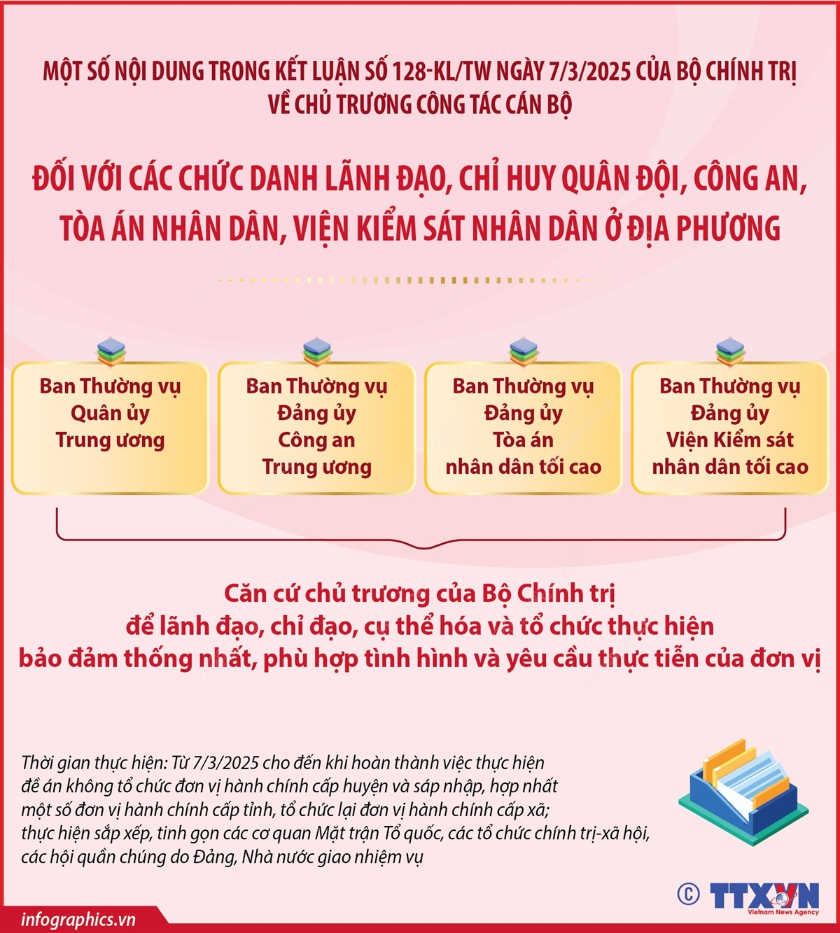 Tại Kết luận số 128-KL/TW ngày 7/3/2025 về chủ trương công tác cán bộ, Bộ Chính trị thống nhất: đối với các chức danh lãnh đạo, chỉ huy quân đội, công an, tòa án nhân dân, viện kiểm sát nhân dân ở địa phương, giao các Ban Thường vụ Quân ủy Trung ương, Đảng ủy Công an Trung ương, Đảng ủy Tòa án nhân dân tối cao, Đảng ủy Viện Kiểm sát nhân dân tối cao căn cứ chủ trương của Bộ Chính trị để lãnh đạo, chỉ đạo, cụ thể hóa và tổ chức thực hiện bảo đảm thống nhất, phù hợp tình hình và yêu cầu thực tiễn của đơn vị.