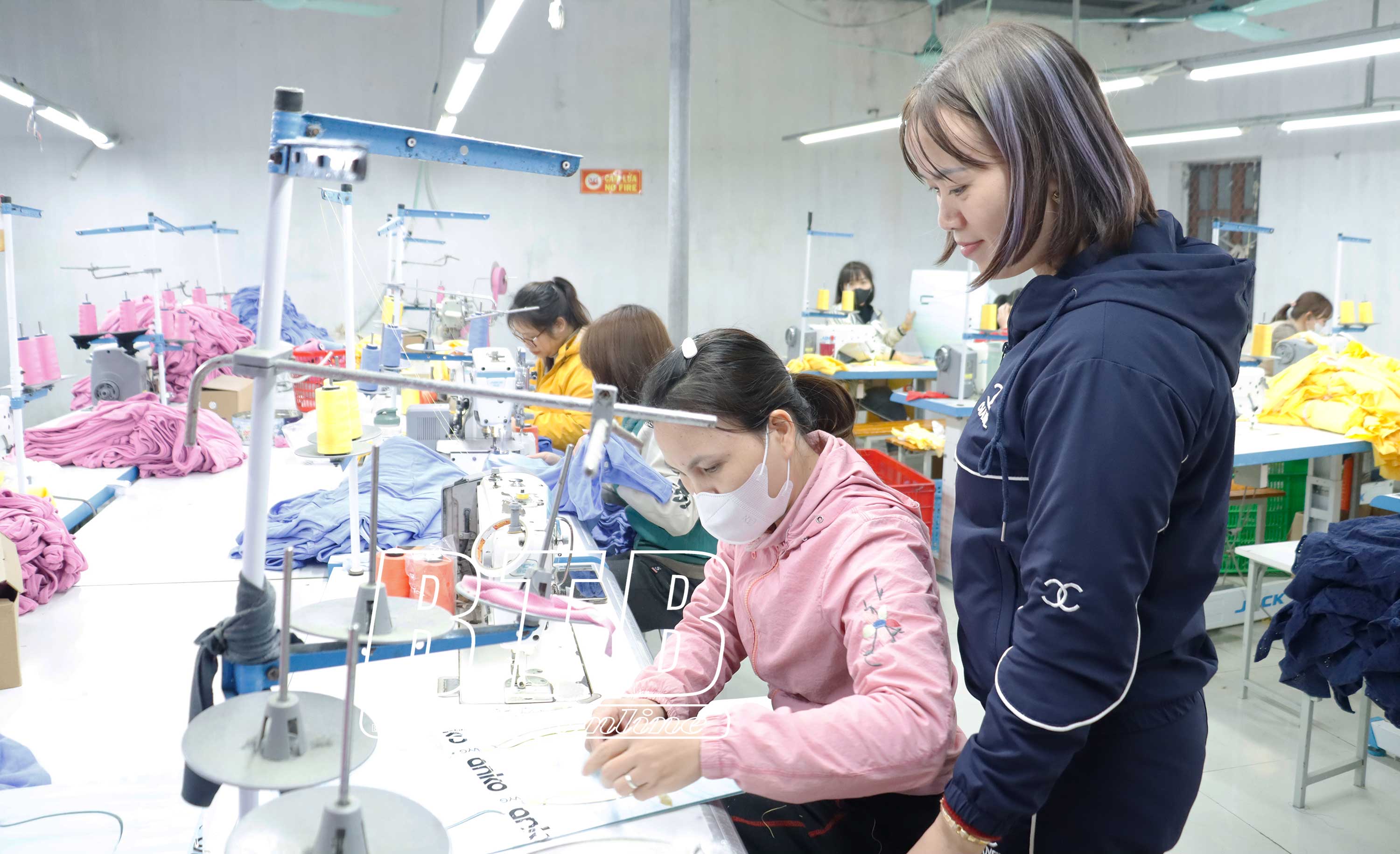 Chị Lê Thị Hằng (đứng), xã Hòa Tiến (Hưng Hà) nhờ được tiếp vốn tín dụng chính sách đã mở được 3 xưởng may, tạo việc làm cho gần 300 lao động.