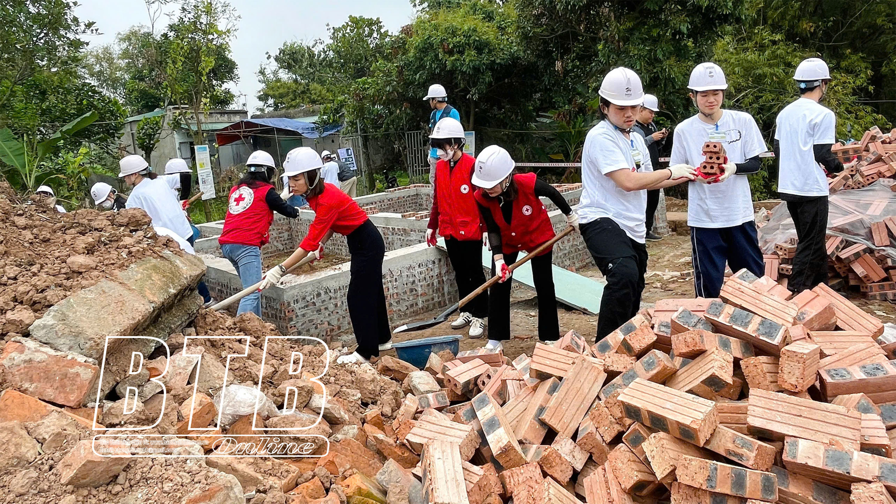 Đoàn tình nguyện viên của tổ chức Habitat for Humanity và tình nguyện viên chữ thập đỏ hỗ trợ xây dựng nhà cho bà Hoàng Thị Tám.